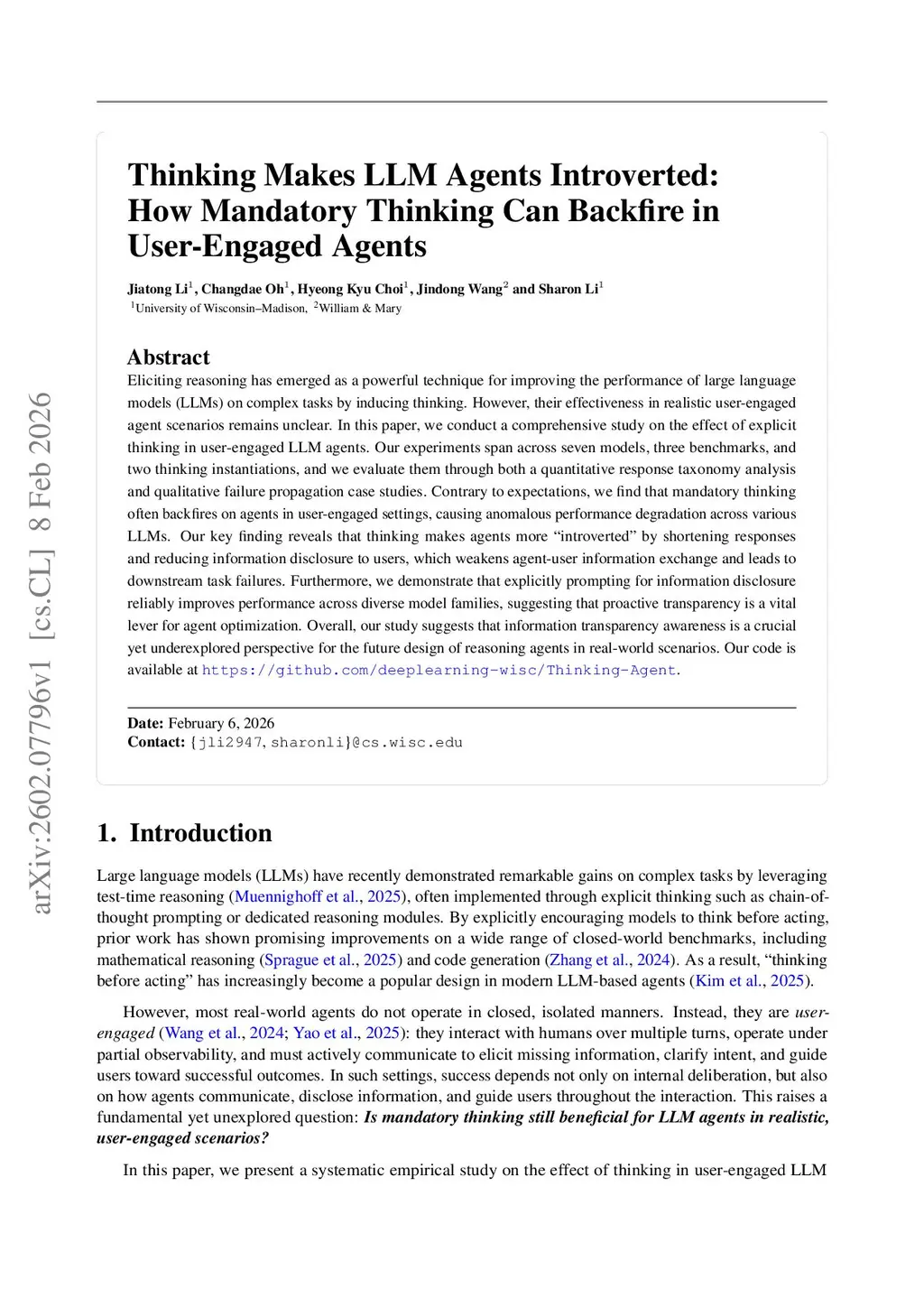Eliciting reasoning has emerged as a powerful technique for improving the performance of large language models (LLMs) on complex tasks by inducing thinking. However, their effectiveness in realistic user-engaged agent scenarios remains unclear. In this paper, we conduct a comprehensive study on the effect of explicit thinking in user-engaged LLM agents. Our experiments span across seven models, three benchmarks, and two thinking instantiations, and we evaluate them through both a quantitative response taxonomy analysis and qualitative failure propagation case studies. Contrary to expectations, we find that mandatory thinking often backfires on agents in user-engaged settings, causing anomalous performance degradation across various LLMs. Our key finding reveals that thinking makes agents more ``introverted'' by shortening responses and reducing information disclosure to users, which weakens agent-user information exchange and leads to downstream task failures. Furthermore, we demonstrate that explicitly prompting for information disclosure reliably improves performance across diverse model families, suggesting that proactive transparency is a vital lever for agent optimization. Overall, our study suggests that information transparency awareness is a crucial yet underexplored perspective for the future design of reasoning agents in real-world scenarios. Our code is available atthis https URL.