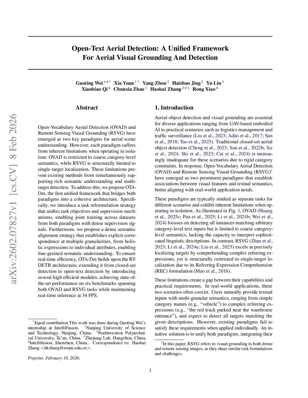 Open-Vocabulary Aerial Detection (OVAD) and Remote Sensing Visual Grounding (RSVG) have emerged as two key paradigms for aerial scene understanding. However, each paradigm suffers from inherent limitations when operating in isolation: OVAD is restricted to coarse category-level semantics, while RSVG is structurally limited to single-target localization. These limitations prevent existing methods from simultaneously supporting rich semantic understanding and multi-target detection. To address this, we propose OTA-Det, the first unified framework that bridges both paradigms into a cohesive architecture. Specifically, we introduce a task reformulation strategy that unifies task objectives and supervision mechanisms, enabling joint training across datasets from both paradigms with dense supervision signals. Furthermore, we propose a dense semantic alignment strategy that establishes explicit correspondence at multiple granularities, from holistic expressions to individual attributes, enabling fine-grained semantic understanding. To ensure real-time efficiency, OTA-Det builds upon the RT-DETR architecture, extending it from closed-set detection to open-text detection by introducing several high efficient modules, achieving state-of-the-art performance on six benchmarks spanning both OVAD and RSVG tasks while maintaining real-time inference at 34 FPS.