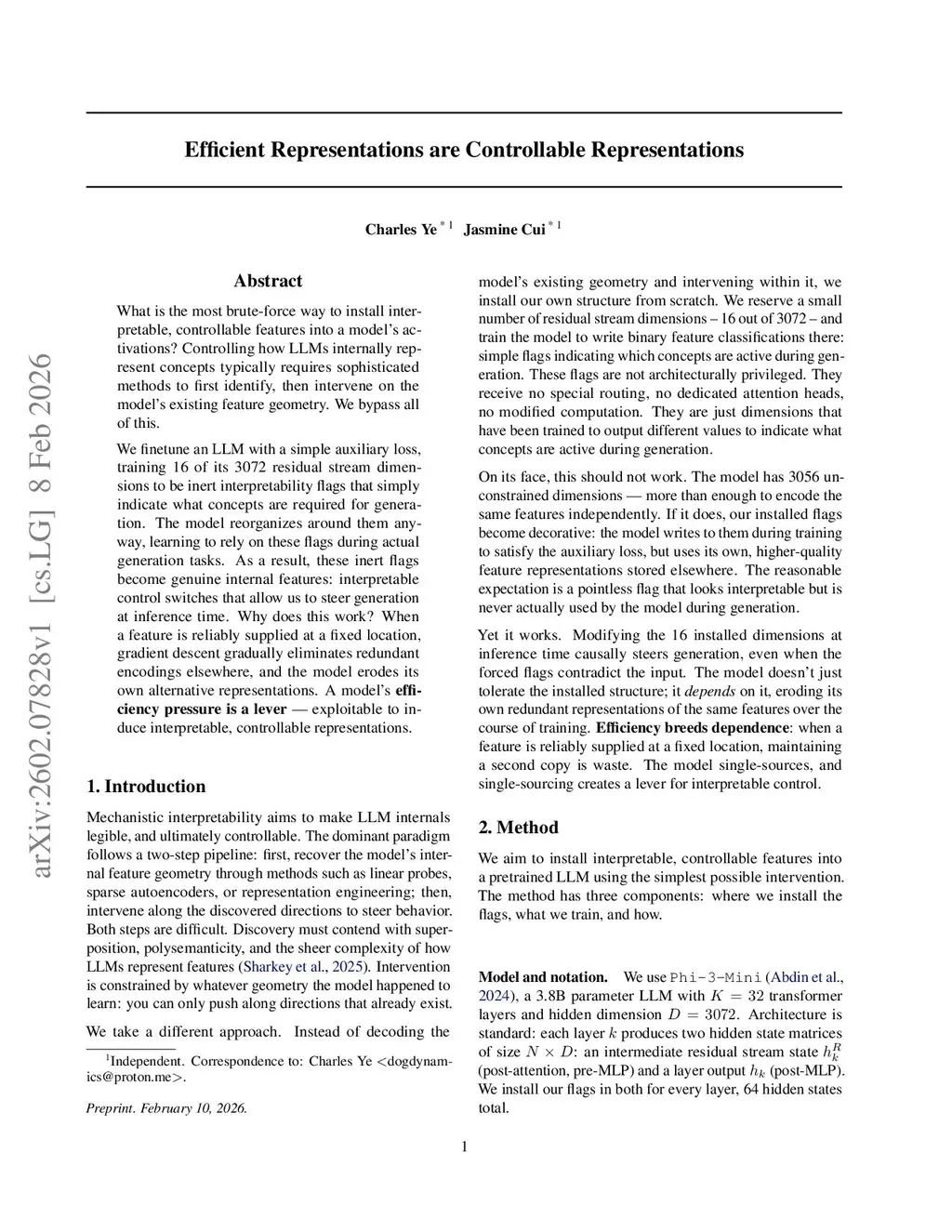 What is the most brute-force way to install interpretable, controllable features into a model's activations? Controlling how LLMs internally represent concepts typically requires sophisticated methods to first identify, then intervene on the model's existing feature geometry. We bypass all of this.We finetune an LLM with a simple auxiliary loss, training 16 of its 3072 residual stream dimensions to be inert interpretability flags that simply indicate what concepts are required for generation. The model reorganizes around them anyway, learning to rely on these flags during actual generation tasks. As a result, these inert flags become genuine internal features: interpretable control switches that allow us to steer generation at inference time. Why does this work? When a feature is reliably supplied at a fixed location, gradient descent gradually eliminates redundant encodings elsewhere, and the model erodes its own alternative representations. A model's efficiency pressure is a lever - exploitable to induce interpretable, controllable representations.