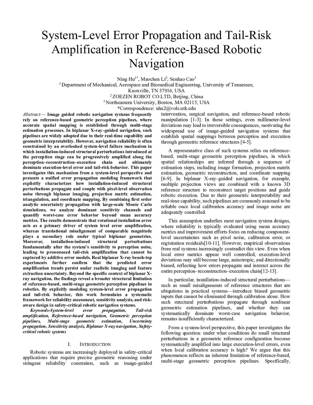 Image guided robotic navigation systems often rely on reference based geometric perception pipelines, where accurate spatial mapping is established through multi stage estimation processes. In biplanar X ray guided navigation, such pipelines are widely used due to their real time capability and geometric interpretability. However, navigation reliability can be constrained by an overlooked system level failure mechanism in which installation induced structural perturbations introduced at the perception stage are progressively amplified along the perception reconstruction execution chain and dominate execution level error and tail risk behavior. This paper investigates this mechanism from a system level perspective and presents a unified error propagation modeling framework that characterizes how installation induced structural perturbations propagate and couple with pixel level observation noise through biplanar imaging, projection matrix estimation, triangulation, and coordinate mapping. Using first order analytic uncertainty propagation and Monte Carlo simulations, we analyze dominant sensitivity channels and quantify worst case error behavior beyond mean accuracy metrics. The results show that rotational installation error is a primary driver of system level error amplification, while translational misalignment of comparable magnitude plays a secondary role under typical biplanar geometries. Real biplanar X ray bench top experiments further confirm that the predicted amplification trends persist under realistic imaging conditions. These findings reveal a broader structural limitation of reference based multi stage geometric perception pipelines and provide a framework for system level reliability analysis and risk aware design in safety critical robotic navigation systems.