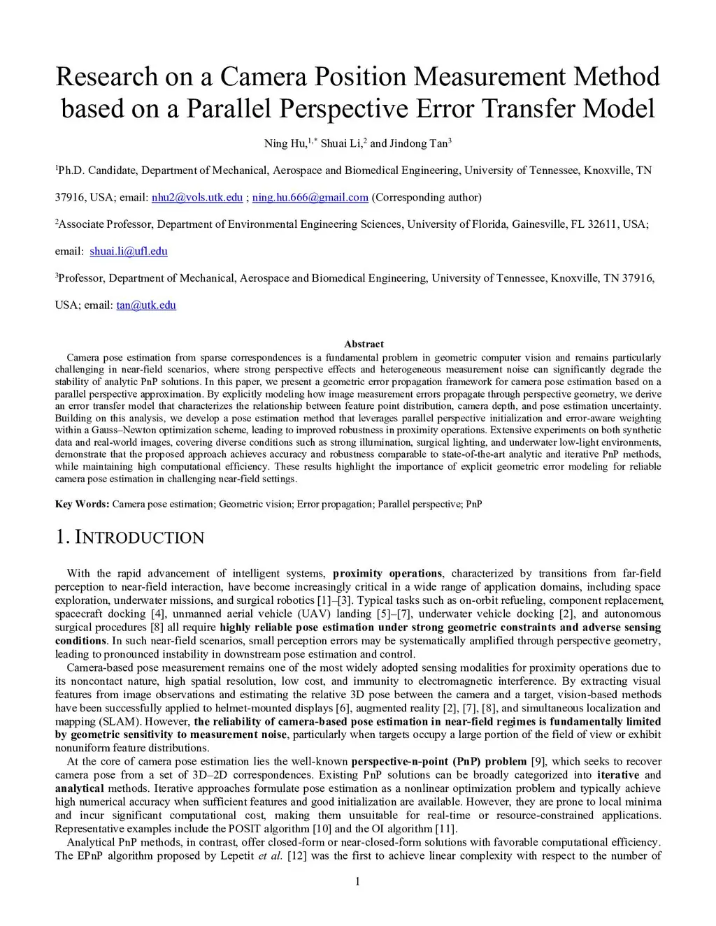 Camera pose estimation from sparse correspondences is a fundamental problem in geometric computer vision and remains particularly challenging in near-field scenarios, where strong perspective effects and heterogeneous measurement noise can significantly degrade the stability of analytic PnP solutions. In this paper, we present a geometric error propagation framework for camera pose estimation based on a parallel perspective approximation. By explicitly modeling how image measurement errors propagate through perspective geometry, we derive an error transfer model that characterizes the relationship between feature point distribution, camera depth, and pose estimation uncertainty. Building on this analysis, we develop a pose estimation method that leverages parallel perspective initialization and error-aware weighting within a Gauss-Newton optimization scheme, leading to improved robustness in proximity operations. Extensive experiments on both synthetic data and real-world images, covering diverse conditions such as strong illumination, surgical lighting, and underwater low-light environments, demonstrate that the proposed approach achieves accuracy and robustness comparable to state-of-the-art analytic and iterative PnP methods, while maintaining high computational efficiency. These results highlight the importance of explicit geometric error modeling for reliable camera pose estimation in challenging near-field settings.