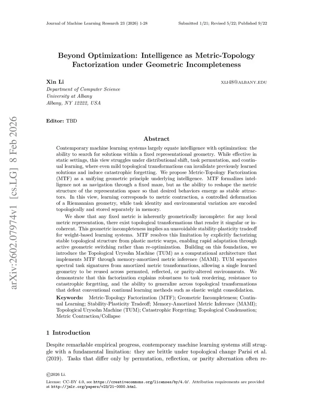 Contemporary ML often equates intelligence with optimization: searching for solutions within a fixed representational geometry. This works in static regimes but breaks under distributional shift, task permutation, and continual learning, where even mild topological changes can invalidate learned solutions and trigger catastrophic forgetting. We propose Metric-Topology Factorization (MTF) as a unifying geometric principle: intelligence is not navigation through a fixed maze, but the ability to reshape representational geometry so desired behaviors become stable attractors. Learning corresponds to metric contraction (a controlled deformation of Riemannian structure), while task identity and environmental variation are encoded topologically and stored separately in memory. We show any fixed metric is geometrically incomplete: for any local metric representation, some topological transformations make it singular or incoherent, implying an unavoidable stability-plasticity tradeoff for weight-based systems. MTF resolves this by factorizing stable topology from plastic metric warps, enabling rapid adaptation via geometric switching rather than re-optimization. Building on this, we introduce the Topological Urysohn Machine (TUM), implementing MTF through memory-amortized metric inference (MAMI): spectral task signatures index amortized metric transformations, letting a single learned geometry be reused across permuted, reflected, or parity-altered environments. This explains robustness to task reordering, resistance to catastrophic forgetting, and generalization across transformations that defeat conventional continual learning methods (e.g., EWC).