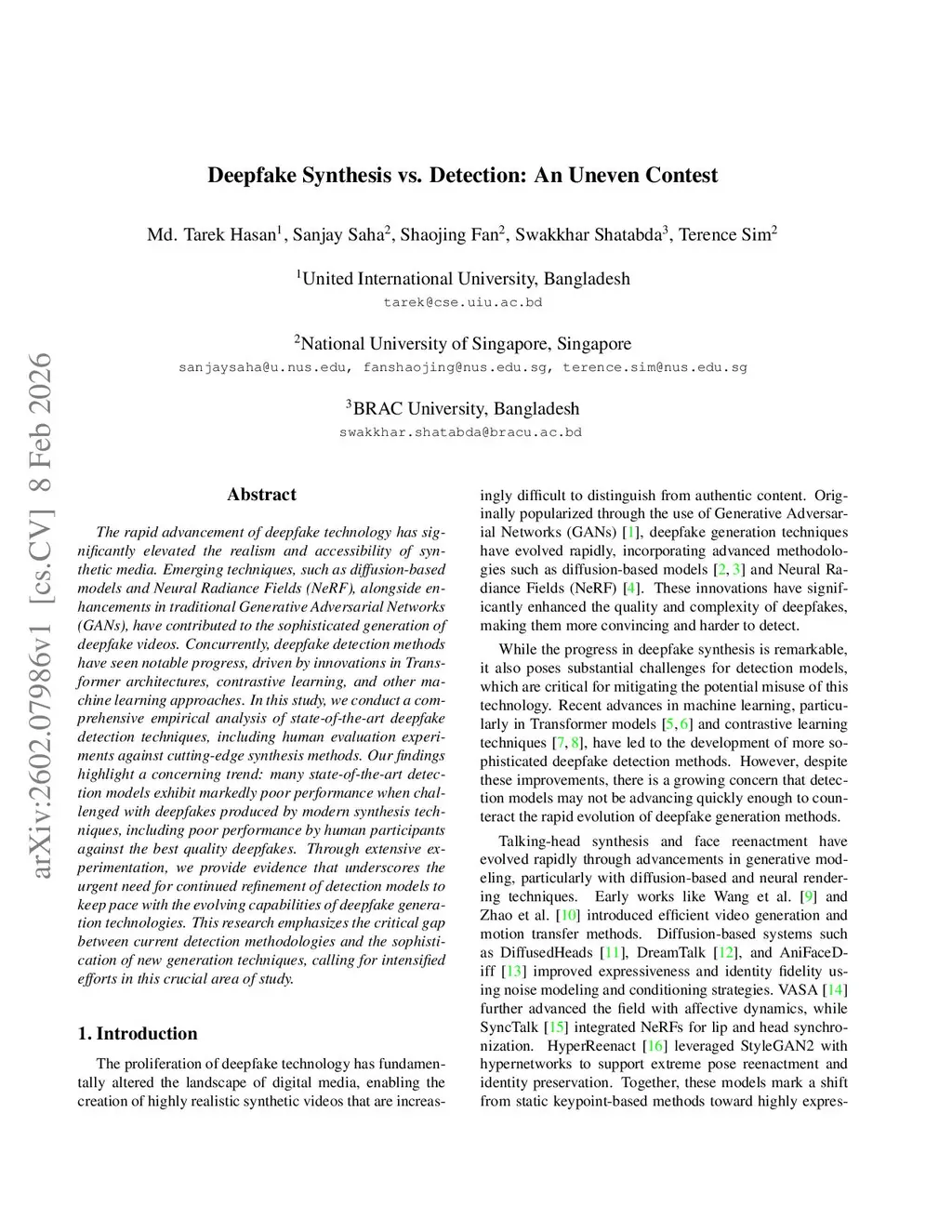 Deepfake Synthesis vs. Detection: An Uneven Contest
