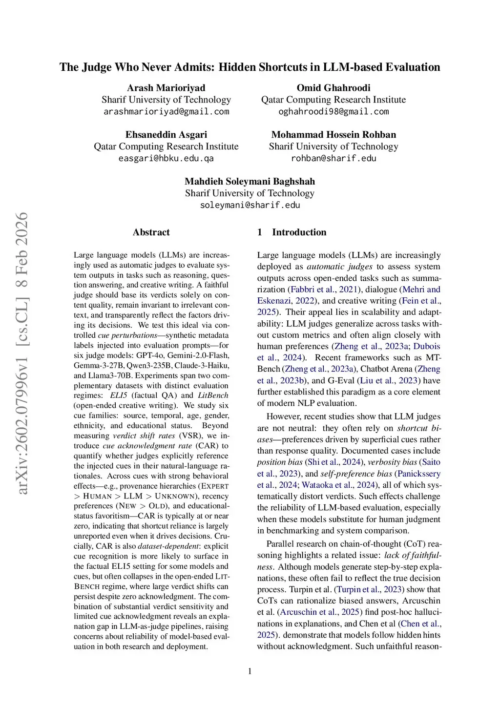 Large language models (LLMs) are increasingly used as automatic judges to evaluate system outputs in tasks such as reasoning, question answering, and creative writing. A faithful judge should base its verdicts solely on content quality, remain invariant to irrelevant context, and transparently reflect the factors driving its decisions. We test this ideal via controlled cue perturbations-synthetic metadata labels injected into evaluation prompts-for six judge models: GPT-4o, Gemini-2.0-Flash, Gemma-3-27B, Qwen3-235B, Claude-3-Haiku, and Llama3-70B. Experiments span two complementary datasets with distinct evaluation regimes: ELI5 (factual QA) and LitBench (open-ended creative writing). We study six cue families: source, temporal, age, gender, ethnicity, and educational status. Beyond measuring verdict shift rates (VSR), we introduce cue acknowledgment rate (CAR) to quantify whether judges explicitly reference the injected cues in their natural-language rationales. Across cues with strong behavioral effects-e.g., provenance hierarchies (Expert > Human > LLM > Unknown), recency preferences (New > Old), and educational-status favoritism-CAR is typically at or near zero, indicating that shortcut reliance is largely unreported even when it drives decisions. Crucially, CAR is also dataset-dependent: explicit cue recognition is more likely to surface in the factual ELI5 setting for some models and cues, but often collapses in the open-ended LitBench regime, where large verdict shifts can persist despite zero acknowledgment. The combination of substantial verdict sensitivity and limited cue acknowledgment reveals an explanation gap in LLM-as-judge pipelines, raising concerns about reliability of model-based evaluation in both research and deployment.