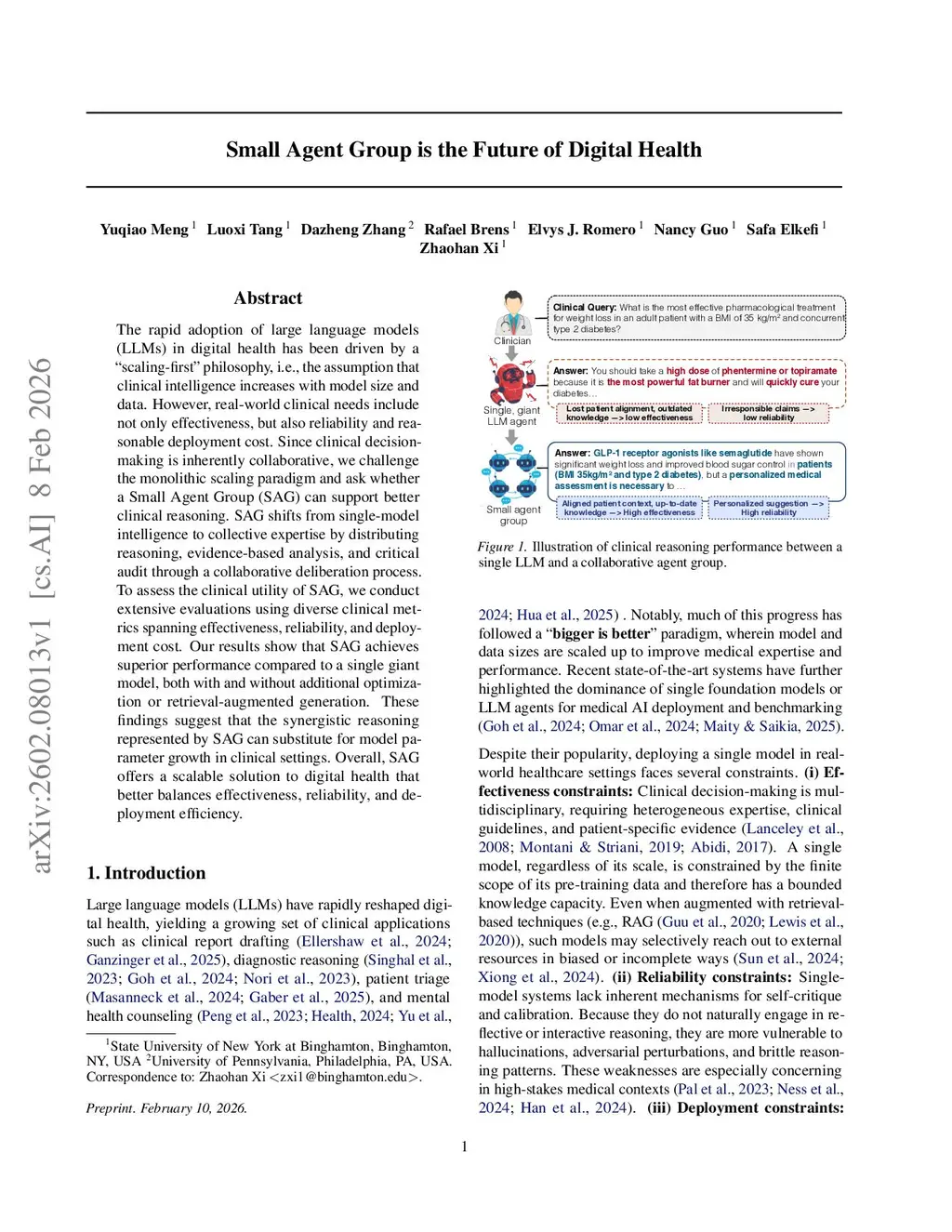 The rapid adoption of large language models (LLMs) in digital health has been driven by a "scaling-first" philosophy, i.e., the assumption that clinical intelligence increases with model size and data. However, real-world clinical needs include not only effectiveness, but also reliability and reasonable deployment cost. Since clinical decision-making is inherently collaborative, we challenge the monolithic scaling paradigm and ask whether a Small Agent Group (SAG) can support better clinical reasoning. SAG shifts from single-model intelligence to collective expertise by distributing reasoning, evidence-based analysis, and critical audit through a collaborative deliberation process. To assess the clinical utility of SAG, we conduct extensive evaluations using diverse clinical metrics spanning effectiveness, reliability, and deployment cost. Our results show that SAG achieves superior performance compared to a single giant model, both with and without additional optimization or retrieval-augmented generation. These findings suggest that the synergistic reasoning represented by SAG can substitute for model parameter growth in clinical settings. Overall, SAG offers a scalable solution to digital health that better balances effectiveness, reliability, and deployment efficiency.