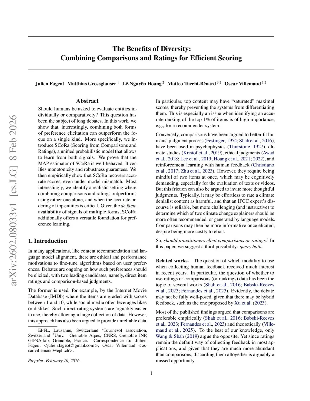 Should humans be asked to evaluate entities individually or comparatively? This question has been the subject of long debates. In this work, we show that, interestingly, combining both forms of preference elicitation can outperform the focus on a single kind. More specifically, we introduce SCoRa (Scoring from Comparisons and Ratings), a unified probabilistic model that allows to learn from both signals. We prove that the MAP estimator of SCoRa is well-behaved. It verifies monotonicity and robustness guarantees. We then empirically show that SCoRa recovers accurate scores, even under model mismatch. Most interestingly, we identify a realistic setting where combining comparisons and ratings outperforms using either one alone, and when the accurate ordering of top entities is critical. Given the de facto availability of signals of multiple forms, SCoRa additionally offers a versatile foundation for preference learning.