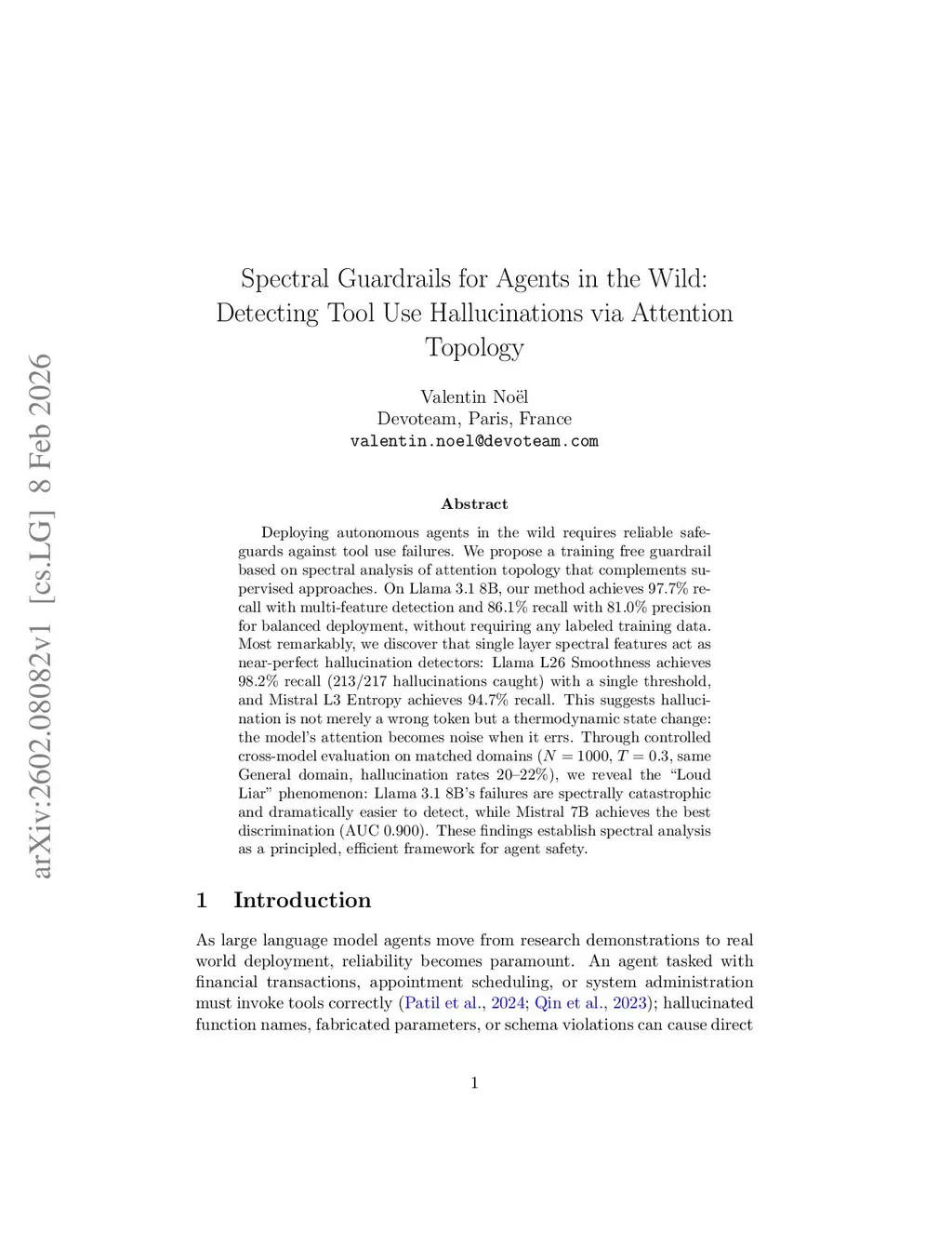 Deploying autonomous agents in the wild requires reliable safeguards against tool use failures. We propose a training free guardrail based on spectral analysis of attention topology that complements supervised approaches. On Llama 3.1 8B, our method achieves 97.7\% recall with multi-feature detection and 86.1\% recall with 81.0\% precision for balanced deployment, without requiring any labeled training data. Most remarkably, we discover that single layer spectral features act as near-perfect hallucination detectors: Llama L26 Smoothness achieves 98.2\% recall (213/217 hallucinations caught) with a single threshold, and Mistral L3 Entropy achieves 94.7\% recall. This suggests hallucination is not merely a wrong token but a thermodynamic state change: the model's attention becomes noise when it errs. Through controlled cross-model evaluation on matched domains (, , same General domain, hallucination rates 20--22\%), we reveal the ``Loud Liar'' phenomenon: Llama 3.1 8B's failures are spectrally catastrophic and dramatically easier to detect, while Mistral 7B achieves the best discrimination (AUC 0.900). These findings establish spectral analysis as a principled, efficient framework for agent safety.