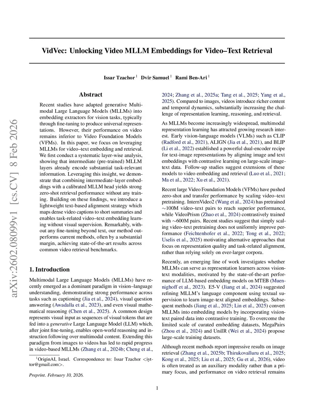 Recent studies have adapted generative Multimodal Large Language Models (MLLMs) into embedding extractors for vision tasks, typically through fine-tuning to produce universal representations. However, their performance on video remains inferior to Video Foundation Models (VFMs). In this paper, we focus on leveraging MLLMs for video-text embedding and retrieval. We first conduct a systematic layer-wise analysis, showing that intermediate (pre-trained) MLLM layers already encode substantial task-relevant information. Leveraging this insight, we demonstrate that combining intermediate-layer embeddings with a calibrated MLLM head yields strong zero-shot retrieval performance without any training. Building on these findings, we introduce a lightweight text-based alignment strategy which maps dense video captions to short summaries and enables task-related video-text embedding learning without visual supervision. Remarkably, without any fine-tuning beyond text, our method outperforms current methods, often by a substantial margin, achieving state-of-the-art results across common video retrieval benchmarks.