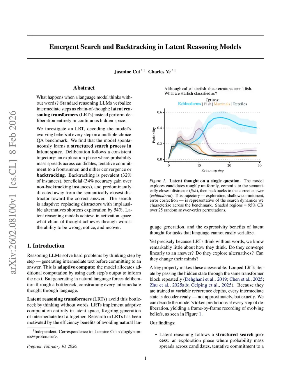 What happens when a language model thinks without words? Standard reasoning LLMs verbalize intermediate steps as chain-of-thought; latent reasoning transformers (LRTs) instead perform deliberation entirely in continuous hidden space. We investigate an LRT, decoding the model's evolving beliefs at every step on a multiple-choice QA benchmark. We find that the model spontaneously learns a structured search process in latent space. Deliberation follows a consistent trajectory: an exploration phase where probability mass spreads across candidates, tentative commitment to a frontrunner, and either convergence or backtracking. Backtracking is prevalent (32% of instances), beneficial (34% accuracy gain over non-backtracking instances), and predominantly directed away from the semantically closest distractor toward the correct answer. The search is adaptive: replacing distractors with implausible alternatives shortens exploration by 54%. Latent reasoning models achieve in activation space what chain-of-thought achieves through words: the ability to be wrong, notice, and recover.