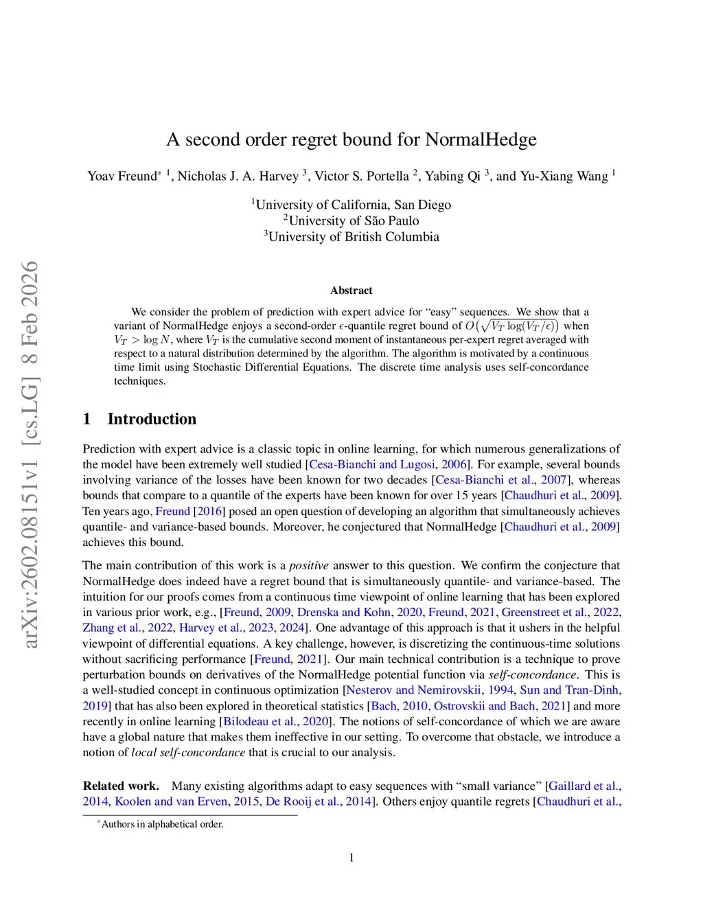 We consider the problem of prediction with expert advice for ``easy'' sequences. We show that a variant of NormalHedge enjoys a second-order -quantile regret bound of $O\big(\sqrt{V_T \log(V_T/\epsilon)}\big) $ when , where is the cumulative second moment of instantaneous per-expert regret averaged with respect to a natural distribution determined by the algorithm. The algorithm is motivated by a continuous time limit using Stochastic Differential Equations. The discrete time analysis uses self-concordance techniques.