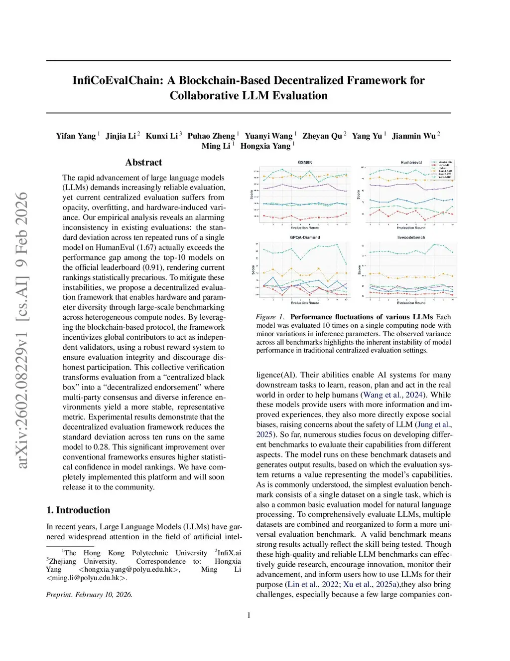 The rapid advancement of large language models (LLMs) demands increasingly reliable evaluation, yet current centralized evaluation suffers from opacity, overfitting, and hardware-induced variance. Our empirical analysis reveals an alarming inconsistency in existing evaluations: the standard deviation across ten repeated runs of a single model on HumanEval (1.67) actually exceeds the performance gap among the top-10 models on the official leaderboard (0.91), rendering current rankings statistically precarious. To mitigate these instabilities, we propose a decentralized evaluation framework that enables hardware and parameter diversity through large-scale benchmarking across heterogeneous compute nodes. By leveraging the blockchain-based protocol, the framework incentivizes global contributors to act as independent validators, using a robust reward system to ensure evaluation integrity and discourage dishonest participation. This collective verification transforms evaluation from a "centralized black box" into a "decentralized endorsement" where multi-party consensus and diverse inference environments yield a more stable, representative metric. Experimental results demonstrate that the decentralized evaluation framework reduces the standard deviation across ten runs on the same model to 0.28. This significant improvement over conventional frameworks ensures higher statistical confidence in model rankings. We have completely implemented this platform and will soon release it to the community.