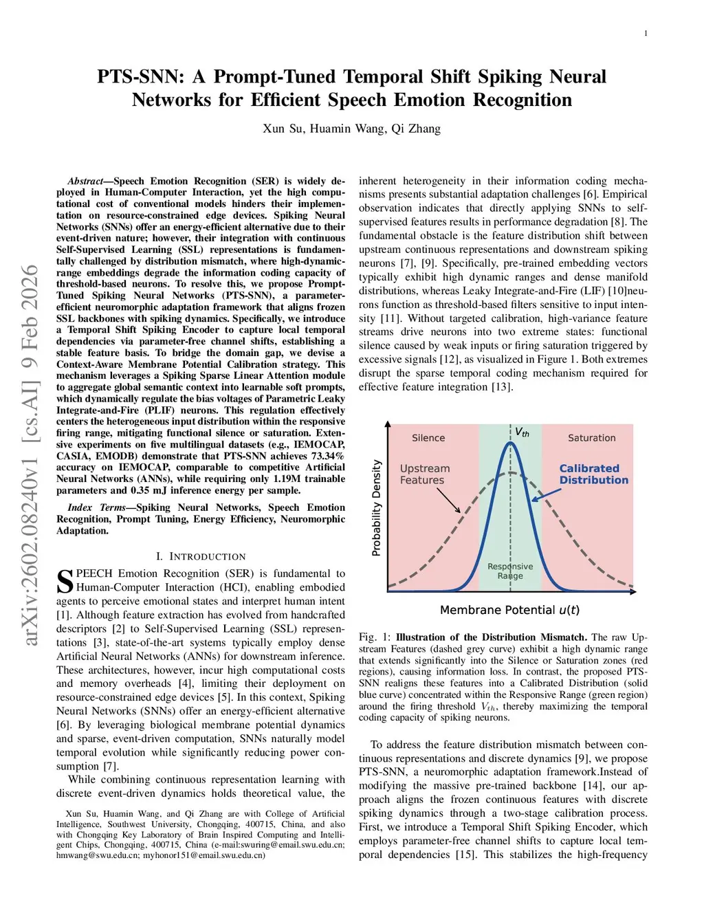 Speech Emotion Recognition (SER) is widely deployed in Human-Computer Interaction, yet the high computational cost of conventional models hinders their implementation on resource-constrained edge devices. Spiking Neural Networks (SNNs) offer an energy-efficient alternative due to their event-driven nature; however, their integration with continuous Self-Supervised Learning (SSL) representations is fundamentally challenged by distribution mismatch, where high-dynamic-range embeddings degrade the information coding capacity of threshold-based neurons. To resolve this, we propose Prompt-Tuned Spiking Neural Networks (PTS-SNN), a parameter-efficient neuromorphic adaptation framework that aligns frozen SSL backbones with spiking dynamics. Specifically, we introduce a Temporal Shift Spiking Encoder to capture local temporal dependencies via parameter-free channel shifts, establishing a stable feature basis. To bridge the domain gap, we devise a Context-Aware Membrane Potential Calibration strategy. This mechanism leverages a Spiking Sparse Linear Attention module to aggregate global semantic context into learnable soft prompts, which dynamically regulate the bias voltages of Parametric Leaky Integrate-and-Fire (PLIF) neurons. This regulation effectively centers the heterogeneous input distribution within the responsive firing range, mitigating functional silence or saturation. Extensive experiments on five multilingual datasets (e.g., IEMOCAP, CASIA, EMODB) demonstrate that PTS-SNN achieves 73.34\% accuracy on IEMOCAP, comparable to competitive Artificial Neural Networks (ANNs), while requiring only 1.19M trainable parameters and 0.35 mJ inference energy per sample.