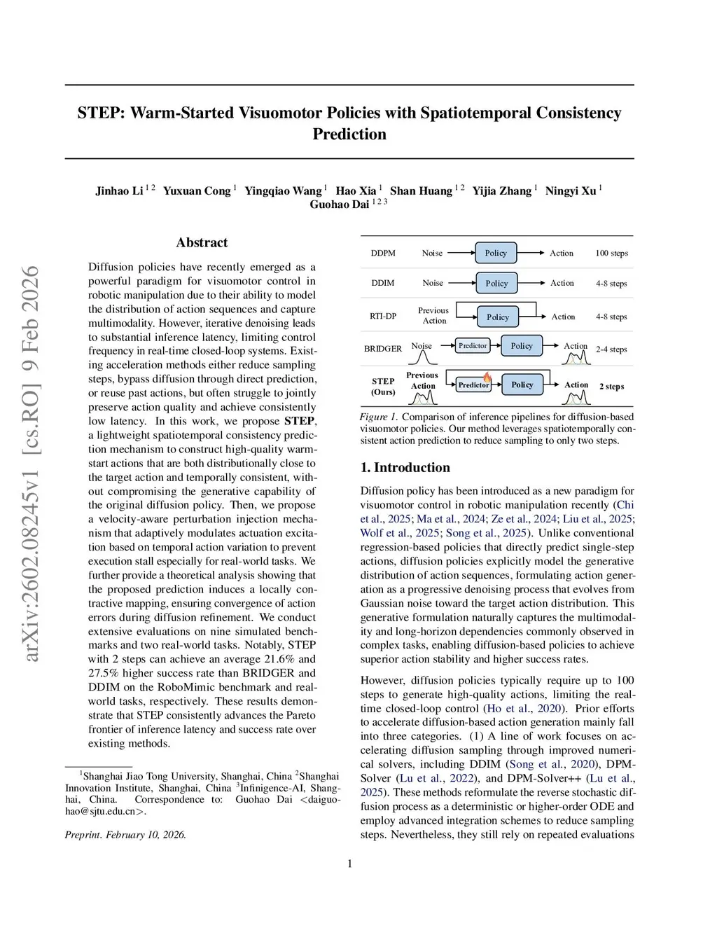 Diffusion policies have recently emerged as a powerful paradigm for visuomotor control in robotic manipulation due to their ability to model the distribution of action sequences and capture multimodality. However, iterative denoising leads to substantial inference latency, limiting control frequency in real-time closed-loop systems. Existing acceleration methods either reduce sampling steps, bypass diffusion through direct prediction, or reuse past actions, but often struggle to jointly preserve action quality and achieve consistently low latency. In this work, we propose STEP, a lightweight spatiotemporal consistency prediction mechanism to construct high-quality warm-start actions that are both distributionally close to the target action and temporally consistent, without compromising the generative capability of the original diffusion policy. Then, we propose a velocity-aware perturbation injection mechanism that adaptively modulates actuation excitation based on temporal action variation to prevent execution stall especially for real-world tasks. We further provide a theoretical analysis showing that the proposed prediction induces a locally contractive mapping, ensuring convergence of action errors during diffusion refinement. We conduct extensive evaluations on nine simulated benchmarks and two real-world tasks. Notably, STEP with 2 steps can achieve an average 21.6% and 27.5% higher success rate than BRIDGER and DDIM on the RoboMimic benchmark and real-world tasks, respectively. These results demonstrate that STEP consistently advances the Pareto frontier of inference latency and success rate over existing methods.