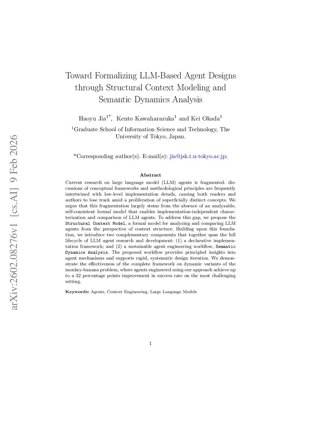 Current research on large language model (LLM) agents is fragmented: discussions of conceptual frameworks and methodological principles are frequently intertwined with low-level implementation details, causing both readers and authors to lose track amid a proliferation of superficially distinct concepts. We argue that this fragmentation largely stems from the absence of an analyzable, self-consistent formal model that enables implementation-independent characterization and comparison of LLM agents. To address this gap, we propose the \texttt{Structural Context Model}, a formal model for analyzing and comparing LLM agents from the perspective of context structure. Building upon this foundation, we introduce two complementary components that together span the full lifecycle of LLM agent research and development: (1) a declarative implementation framework; and (2) a sustainable agent engineering workflow, \texttt{Semantic Dynamics Analysis}. The proposed workflow provides principled insights into agent mechanisms and supports rapid, systematic design iteration. We demonstrate the effectiveness of the complete framework on dynamic variants of the monkey-banana problem, where agents engineered using our approach achieve up to a 32 percentage points improvement in success rate on the most challenging setting.