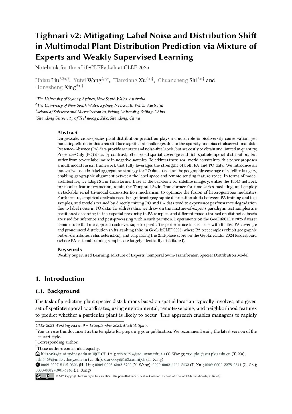 Large-scale, cross-species plant distribution prediction plays a crucial role in biodiversity conservation, yet modeling efforts in this area still face significant challenges due to the sparsity and bias of observational data. Presence-Absence (PA) data provide accurate and noise-free labels, but are costly to obtain and limited in quantity; Presence-Only (PO) data, by contrast, offer broad spatial coverage and rich spatiotemporal distribution, but suffer from severe label noise in negative samples. To address these real-world constraints, this paper proposes a multimodal fusion framework that fully leverages the strengths of both PA and PO data. We introduce an innovative pseudo-label aggregation strategy for PO data based on the geographic coverage of satellite imagery, enabling geographic alignment between the label space and remote sensing feature space. In terms of model architecture, we adopt Swin Transformer Base as the backbone for satellite imagery, utilize the TabM network for tabular feature extraction, retain the Temporal Swin Transformer for time-series modeling, and employ a stackable serial tri-modal cross-attention mechanism to optimize the fusion of heterogeneous modalities. Furthermore, empirical analysis reveals significant geographic distribution shifts between PA training and test samples, and models trained by directly mixing PO and PA data tend to experience performance degradation due to label noise in PO data. To address this, we draw on the mixture-of-experts paradigm: test samples are partitioned according to their spatial proximity to PA samples, and different models trained on distinct datasets are used for inference and post-processing within each partition. Experiments on the GeoLifeCLEF 2025 dataset demonstrate that our approach achieves superior predictive performance in scenarios with limited PA coverage and pronounced distribution shifts.