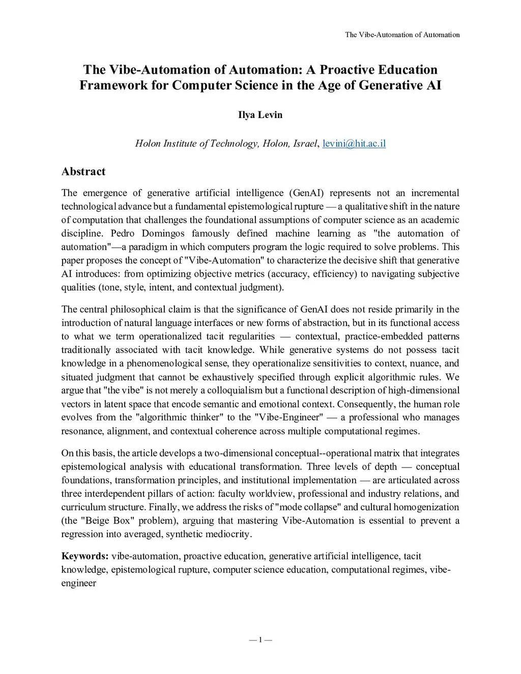 The emergence of generative artificial intelligence (GenAI) represents not an incremental technological advance but a qualitative epistemological shift that challenges foundational assumptions of computer science. Whereas machine learning has been described as the automation of automation, generative AI operates by navigating contextual, semantic, and stylistic coherence rather than optimizing predefined objective metrics. This paper introduces the concept of Vibe-Automation to characterize this transition.The central claim is that the significance of GenAI lies in its functional access to operationalized tacit regularities: context-sensitive patterns embedded in practice that cannot be fully specified through explicit algorithmic rules. Although generative systems do not possess tacit knowledge in a phenomenological sense, they operationalize sensitivities to tone, intent, and situated judgment encoded in high-dimensional latent representations. On this basis, the human role shifts from algorithmic problem specification toward Vibe-Engineering, understood as the orchestration of alignment and contextual judgment in generative systems.The paper connects this epistemological shift to educational and institutional transformation by proposing a conceptual framework structured across three analytical levels and three domains of action: faculty worldview, industry relations, and curriculum design. The risks of mode collapse and cultural homogenization are briefly discussed, emphasizing the need for deliberate engagement with generative systems to avoid regression toward synthetic uniformity.