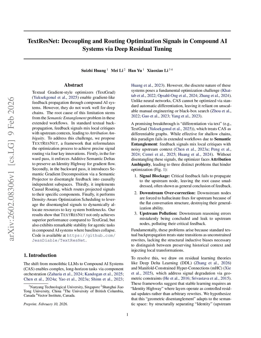 Textual Gradient-style optimizers (TextGrad) enable gradient-like feedback propagation through compound AI systems. However, they do not work well for deep chains. The root cause of this limitation stems from the Semantic Entanglement problem in these extended workflows. In standard textual backpropagation, feedback signals mix local critiques with upstream contexts, leading to Attribution Ambiguity. To address this challenge, we propose TextResNet, a framework that reformulates the optimization process to achieve precise signal routing via four key innovations. Firstly, in the forward pass, it enforces Additive Semantic Deltas to preserve an Identity Highway for gradient flow. Secondly, in the backward pass, it introduces Semantic Gradient Decomposition via a Semantic Projector to disentangle feedback into causally independent subspaces. Thirdly, it implements Causal Routing, which routes projected signals to their specific components. Finally, it performs Density-Aware Optimization Scheduling to leverage the disentangled signals to dynamically allocate resources to key system bottlenecks. Our results show that TextResNet not only achieves superior performance compared to TextGrad, but also exhibits remarkable stability for agentic tasks in compound AI systems where baselines collapse. Code is available atthis https URL.