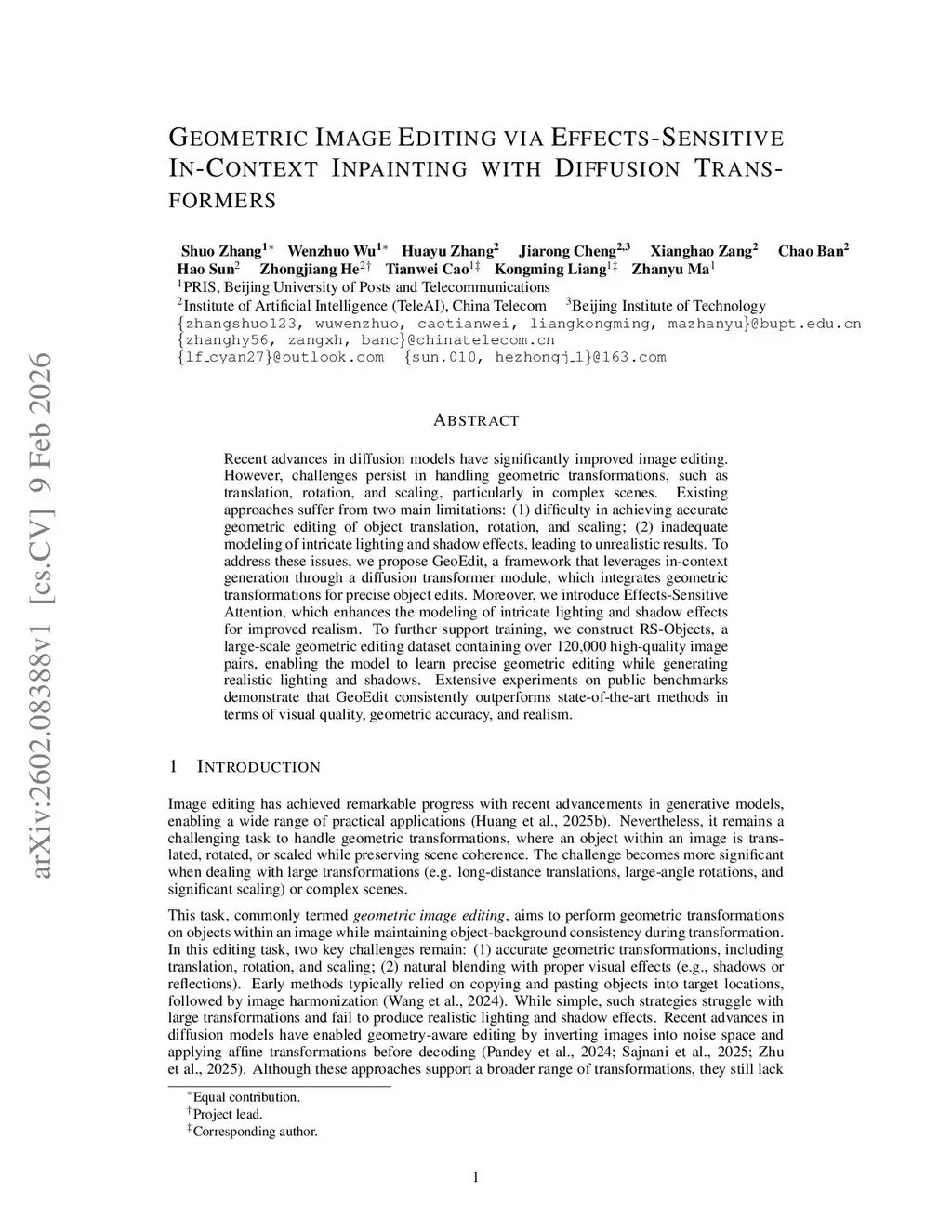 Recent advances in diffusion models have significantly improved image editing. However, challenges persist in handling geometric transformations, such as translation, rotation, and scaling, particularly in complex scenes. Existing approaches suffer from two main limitations: (1) difficulty in achieving accurate geometric editing of object translation, rotation, and scaling; (2) inadequate modeling of intricate lighting and shadow effects, leading to unrealistic results. To address these issues, we propose GeoEdit, a framework that leverages in-context generation through a diffusion transformer module, which integrates geometric transformations for precise object edits. Moreover, we introduce Effects-Sensitive Attention, which enhances the modeling of intricate lighting and shadow effects for improved realism. To further support training, we construct RS-Objects, a large-scale geometric editing dataset containing over 120,000 high-quality image pairs, enabling the model to learn precise geometric editing while generating realistic lighting and shadows. Extensive experiments on public benchmarks demonstrate that GeoEdit consistently outperforms state-of-the-art methods in terms of visual quality, geometric accuracy, and realism.