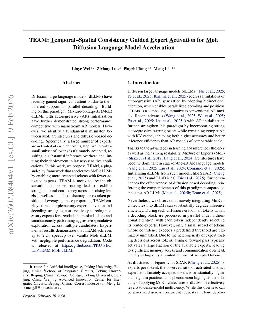 Diffusion large language models (dLLMs) have recently gained significant attention due to their inherent support for parallel decoding. Building on this paradigm, Mixture-of-Experts (MoE) dLLMs with autoregressive (AR) initialization have further demonstrated strong performance competitive with mainstream AR models. However, we identify a fundamental mismatch between MoE architectures and diffusion-based decoding. Specifically, a large number of experts are activated at each denoising step, while only a small subset of tokens is ultimately accepted, resulting in substantial inference overhead and limiting their deployment in latency-sensitive applications. In this work, we propose TEAM, a plug-and-play framework that accelerates MoE dLLMs by enabling more accepted tokens with fewer activated experts. TEAM is motivated by the observation that expert routing decisions exhibit strong temporal consistency across denoising levels as well as spatial consistency across token positions. Leveraging these properties, TEAM employs three complementary expert activation and decoding strategies, conservatively selecting necessary experts for decoded and masked tokens and simultaneously performing aggressive speculative exploration across multiple candidates. Experimental results demonstrate that TEAM achieves up to 2.2x speedup over vanilla MoE dLLM, with negligible performance degradation. Code is released atthis https URL.