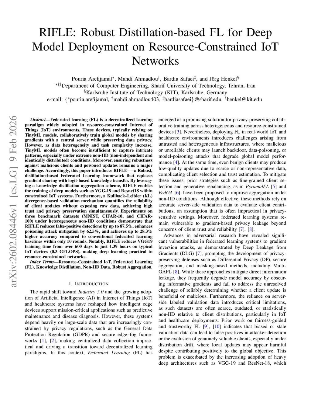 Federated learning (FL) is a decentralized learning paradigm widely adopted in resource-constrained Internet of Things (IoT) environments. These devices, typically relying on TinyML models, collaboratively train global models by sharing gradients with a central server while preserving data privacy. However, as data heterogeneity and task complexity increase, TinyML models often become insufficient to capture intricate patterns, especially under extreme non-IID (non-independent and identically distributed) conditions. Moreover, ensuring robustness against malicious clients and poisoned updates remains a major challenge. Accordingly, this paper introduces RIFLE - a Robust, distillation-based Federated Learning framework that replaces gradient sharing with logit-based knowledge transfer. By leveraging a knowledge distillation aggregation scheme, RIFLE enables the training of deep models such as VGG-19 and Resnet18 within constrained IoT systems. Furthermore, a Kullback-Leibler (KL) divergence-based validation mechanism quantifies the reliability of client updates without exposing raw data, achieving high trust and privacy preservation simultaneously. Experiments on three benchmark datasets (MNIST, CIFAR-10, and CIFAR-100) under heterogeneous non-IID conditions demonstrate that RIFLE reduces false-positive detections by up to 87.5%, enhances poisoning attack mitigation by 62.5%, and achieves up to 28.3% higher accuracy compared to conventional federated learning baselines within only 10 rounds. Notably, RIFLE reduces VGG19 training time from over 600 days to just 1.39 hours on typical IoT devices (0.3 GFLOPS), making deep learning practical in resource-constrained networks.