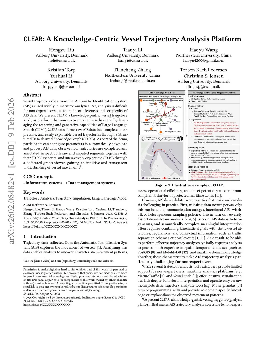 Vessel trajectory data from the Automatic Identification System (AIS) is used widely in maritime analytics. Yet, analysis is difficult for non-expert users due to the incompleteness and complexity of AIS data. We present CLEAR, a knowledge-centric vessel trajectory analysis platform that aims to overcome these barriers. By leveraging the reasoning and generative capabilities of Large Language Models (LLMs), CLEAR transforms raw AIS data into complete, interpretable, and easily explorable vessel trajectories through a Structured Data-derived Knowledge Graph (SD-KG). As part of the demo, participants can configure parameters to automatically download and process AIS data, observe how trajectories are completed and annotated, inspect both raw and imputed segments together with their SD-KG evidence, and interactively explore the SD-KG through a dedicated graph viewer, gaining an intuitive and transparent understanding of vessel movements.