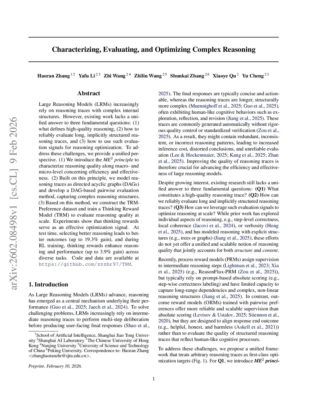 Large Reasoning Models (LRMs) increasingly rely on reasoning traces with complex internal structures. However, existing work lacks a unified answer to three fundamental questions: (1) what defines high-quality reasoning, (2) how to reliably evaluate long, implicitly structured reasoning traces, and (3) how to use such evaluation signals for reasoning optimization. To address these challenges, we provide a unified perspective. (1) We introduce the ME principle to characterize reasoning quality along macro- and micro-level concerning efficiency and effectiveness. (2) Built on this principle, we model reasoning traces as directed acyclic graphs (DAGs) and develop a DAG-based pairwise evaluation method, capturing complex reasoning structures. (3) Based on this method, we construct the TRM-Preference dataset and train a Thinking Reward Model (TRM) to evaluate reasoning quality at scale. Experiments show that thinking rewards serve as an effective optimization signal. At test time, selecting better reasoning leads to better outcomes (up to 19.3% gain), and during RL training, thinking rewards enhance reasoning and performance (up to 3.9% gain) across diverse tasks.