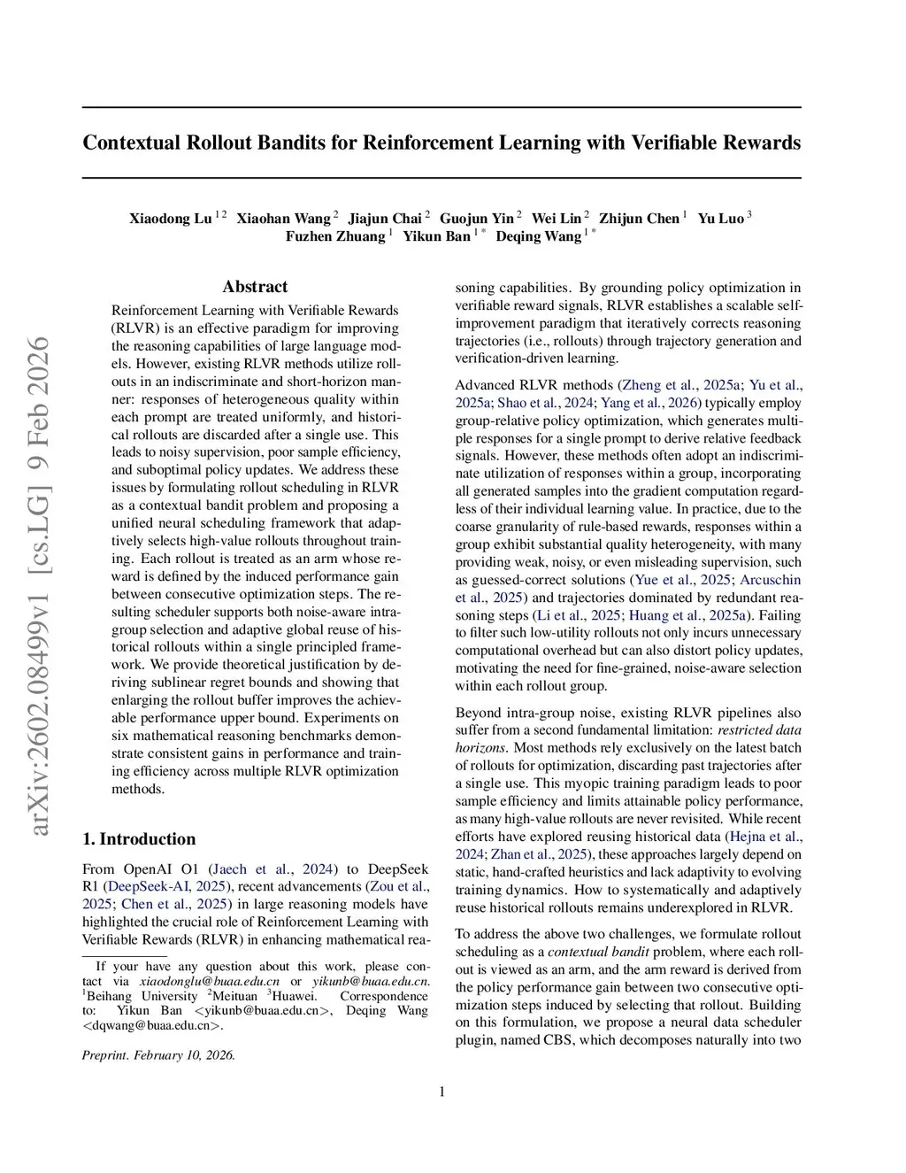 Reinforcement Learning with Verifiable Rewards (RLVR) is an effective paradigm for improving the reasoning capabilities of large language models. However, existing RLVR methods utilize rollouts in an indiscriminate and short-horizon manner: responses of heterogeneous quality within each prompt are treated uniformly, and historical rollouts are discarded after a single use. This leads to noisy supervision, poor sample efficiency, and suboptimal policy updates. We address these issues by formulating rollout scheduling in RLVR as a contextual bandit problem and proposing a unified neural scheduling framework that adaptively selects high-value rollouts throughout training. Each rollout is treated as an arm whose reward is defined by the induced performance gain between consecutive optimization steps. The resulting scheduler supports both noise-aware intra-group selection and adaptive global reuse of historical rollouts within a single principled framework. We provide theoretical justification by deriving sublinear regret bounds and showing that enlarging the rollout buffer improves the achievable performance upper bound. Experiments on six mathematical reasoning benchmarks demonstrate consistent gains in performance and training efficiency across multiple RLVR optimization methods.