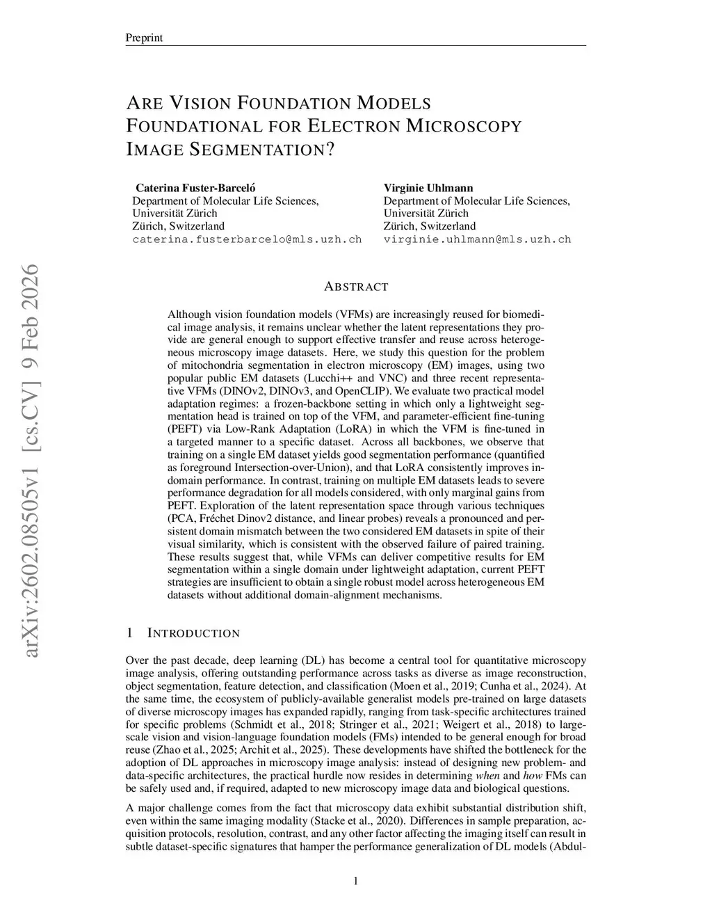 Although vision foundation models (VFMs) are increasingly reused for biomedical image analysis, it remains unclear whether the latent representations they provide are general enough to support effective transfer and reuse across heterogeneous microscopy image datasets. Here, we study this question for the problem of mitochondria segmentation in electron microscopy (EM) images, using two popular public EM datasets (Lucchi++ and VNC) and three recent representative VFMs (DINOv2, DINOv3, and OpenCLIP). We evaluate two practical model adaptation regimes: a frozen-backbone setting in which only a lightweight segmentation head is trained on top of the VFM, and parameter-efficient fine-tuning (PEFT) via Low-Rank Adaptation (LoRA) in which the VFM is fine-tuned in a targeted manner to a specific dataset. Across all backbones, we observe that training on a single EM dataset yields good segmentation performance (quantified as foreground Intersection-over-Union), and that LoRA consistently improves in-domain performance. In contrast, training on multiple EM datasets leads to severe performance degradation for all models considered, with only marginal gains from PEFT. Exploration of the latent representation space through various techniques (PCA, Fréchet Dinov2 distance, and linear probes) reveals a pronounced and persistent domain mismatch between the two considered EM datasets in spite of their visual similarity, which is consistent with the observed failure of paired training. These results suggest that, while VFMs can deliver competitive results for EM segmentation within a single domain under lightweight adaptation, current PEFT strategies are insufficient to obtain a single robust model across heterogeneous EM datasets without additional domain-alignment mechanisms.