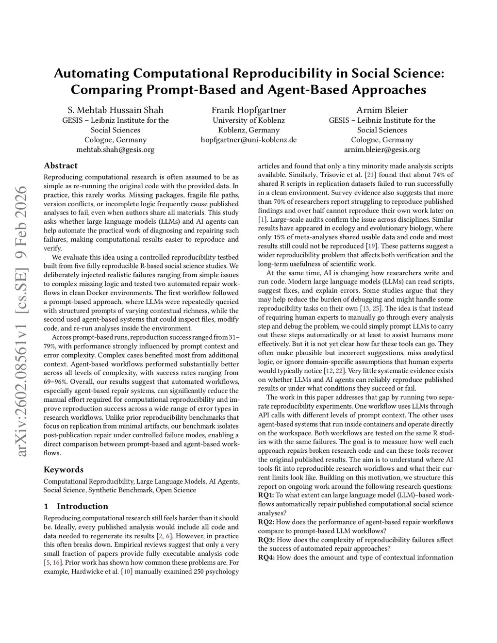 Reproducing computational research is often assumed to be as simple as rerunning the original code with provided data. In practice, missing packages, fragile file paths, version conflicts, or incomplete logic frequently cause analyses to fail, even when materials are shared. This study investigates whether large language models and AI agents can automate the diagnosis and repair of such failures, making computational results easier to reproduce and verify. We evaluate this using a controlled reproducibility testbed built from five fully reproducible R-based social science studies. Realistic failures were injected, ranging from simple issues to complex missing logic, and two automated repair workflows were tested in clean Docker environments. The first workflow is prompt-based, repeatedly querying language models with structured prompts of varying context, while the second uses agent-based systems that inspect files, modify code, and rerun analyses autonomously. Across prompt-based runs, reproduction success ranged from 31-79 percent, with performance strongly influenced by prompt context and error complexity. Complex cases benefited most from additional context. Agent-based workflows performed substantially better, with success rates of 69-96 percent across all complexity levels. These results suggest that automated workflows, especially agent-based systems, can significantly reduce manual effort and improve reproduction success across diverse error types. Unlike prior benchmarks, our testbed isolates post-publication repair under controlled failure modes, allowing direct comparison of prompt-based and agent-based approaches.