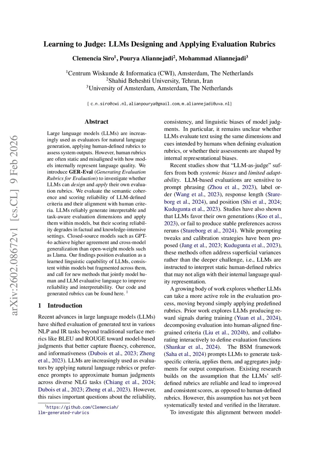 Large language models (LLMs) are increasingly used as evaluators for natural language generation, applying human-defined rubrics to assess system outputs. However, human rubrics are often static and misaligned with how models internally represent language quality. We introduce GER-Eval (Generating Evaluation Rubrics for Evaluation) to investigate whether LLMs can design and apply their own evaluation rubrics. We evaluate the semantic coherence and scoring reliability of LLM-defined criteria and their alignment with human criteria. LLMs reliably generate interpretable and task-aware evaluation dimensions and apply them consistently within models, but their scoring reliability degrades in factual and knowledge-intensive settings. Closed-source models such as GPT-4o achieve higher agreement and cross-model generalization than open-weight models such as Llama. Our findings position evaluation as a learned linguistic capability of LLMs, consistent within models but fragmented across them, and call for new methods that jointly model human and LLM evaluative language to improve reliability and interpretability.
