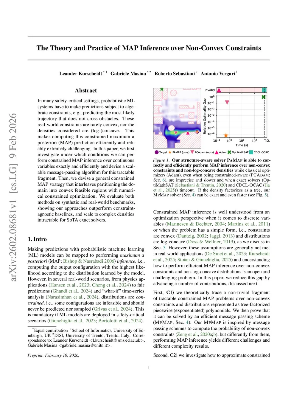In many safety-critical settings, probabilistic ML systems have to make predictions subject to algebraic constraints, e.g., predicting the most likely trajectory that does not cross obstacles. These real-world constraints are rarely convex, nor the densities considered are (log-)concave. This makes computing this constrained maximum a posteriori (MAP) prediction efficiently and reliably extremely challenging. In this paper, we first investigate under which conditions we can perform constrained MAP inference over continuous variables exactly and efficiently and devise a scalable message-passing algorithm for this tractable fragment. Then, we devise a general constrained MAP strategy that interleaves partitioning the domain into convex feasible regions with numerical constrained optimization. We evaluate both methods on synthetic and real-world benchmarks, showing our approaches outperform constraint-agnostic baselines, and scale to complex densities intractable for SoTA exact solvers.