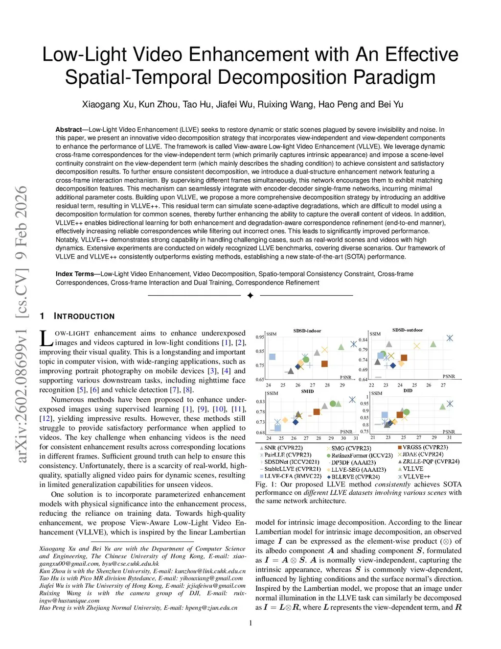 Low-Light Video Enhancement (LLVE) seeks to restore dynamic or static scenes plagued by severe invisibility and noise. In this paper, we present an innovative video decomposition strategy that incorporates view-independent and view-dependent components to enhance the performance of LLVE. The framework is called View-aware Low-light Video Enhancement (VLLVE). We leverage dynamic cross-frame correspondences for the view-independent term (which primarily captures intrinsic appearance) and impose a scene-level continuity constraint on the view-dependent term (which mainly describes the shading condition) to achieve consistent and satisfactory decomposition results. To further ensure consistent decomposition, we introduce a dual-structure enhancement network featuring a cross-frame interaction mechanism. By supervising different frames simultaneously, this network encourages them to exhibit matching decomposition features. This mechanism can seamlessly integrate with encoder-decoder single-frame networks, incurring minimal additional parameter costs. Building upon VLLVE, we propose a more comprehensive decomposition strategy by introducing an additive residual term, resulting in VLLVE++. This residual term can simulate scene-adaptive degradations, which are difficult to model using a decomposition formulation for common scenes, thereby further enhancing the ability to capture the overall content of videos. In addition, VLLVE++ enables bidirectional learning for both enhancement and degradation-aware correspondence refinement (end-to-end manner), effectively increasing reliable correspondences while filtering out incorrect ones. Notably, VLLVE++ demonstrates strong capability in handling challenging cases, such as real-world scenes and videos with high dynamics. Extensive experiments are conducted on widely recognized LLVE benchmarks.