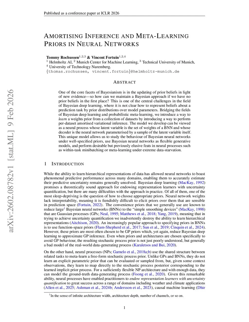 One of the core facets of Bayesianism is in the updating of prior beliefs in light of new evidenceso how can we maintain a Bayesian approach if we have no prior beliefs in the first place? This is one of the central challenges in the field of Bayesian deep learning, where it is not clear how to represent beliefs about a prediction task by prior distributions over model parameters. Bridging the fields of Bayesian deep learning and probabilistic meta-learning, we introduce a way to a weights prior from a collection of datasets by introducing a way to perform per-dataset amortised variational inference. The model we develop can be viewed as a neural process whose latent variable is the set of weights of a BNN and whose decoder is the neural network parameterised by a sample of the latent variable itself. This unique model allows us to study the behaviour of Bayesian neural networks under well-specified priors, use Bayesian neural networks as flexible generative models, and perform desirable but previously elusive feats in neural processes such as within-task minibatching or meta-learning under extreme data-starvation.