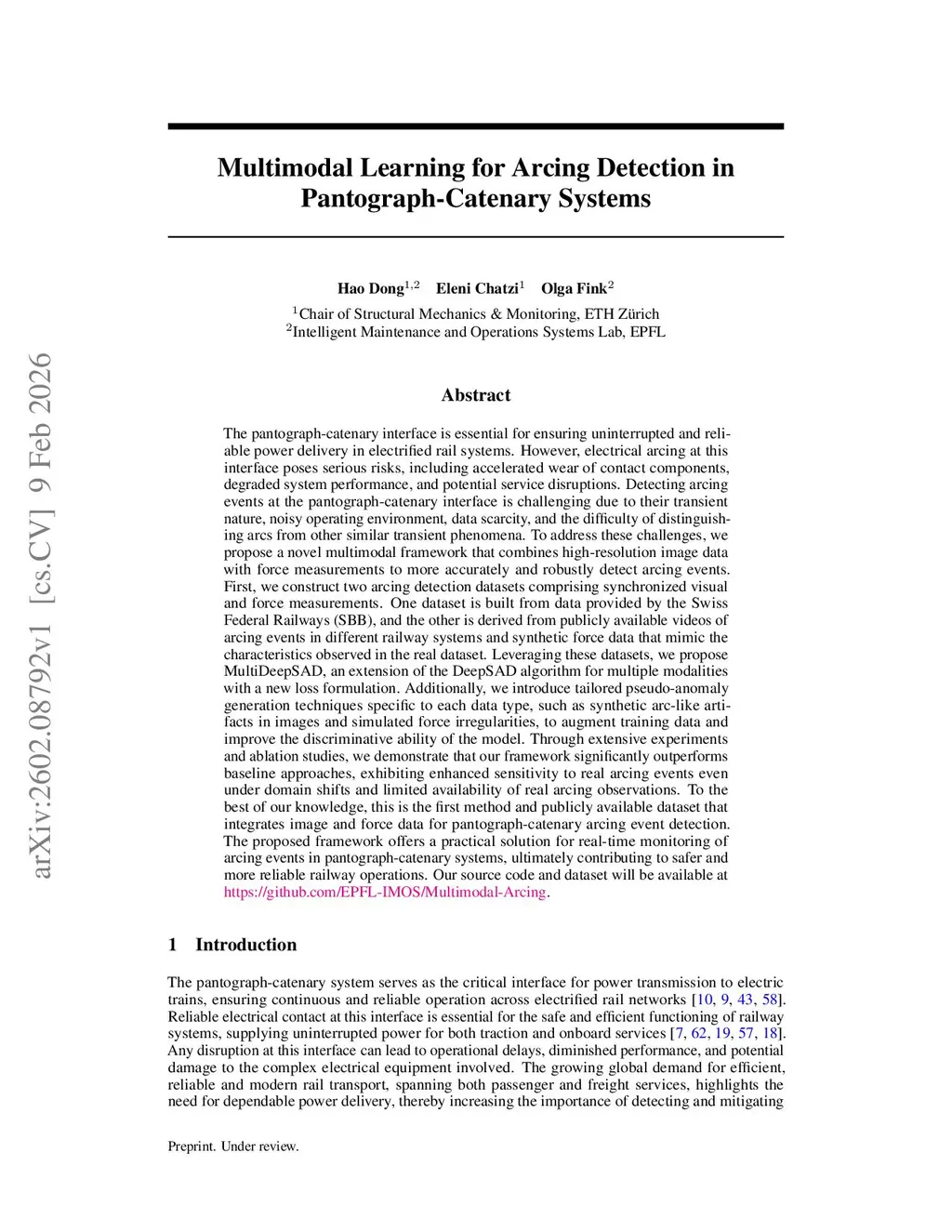 The pantograph-catenary interface is essential for ensuring uninterrupted and reliable power delivery in electrified rail systems. However, electrical arcing at this interface poses serious risks, including accelerated wear of contact components, degraded system performance, and potential service disruptions. Detecting arcing events at the pantograph-catenary interface is challenging due to their transient nature, noisy operating environment, data scarcity, and the difficulty of distinguishing arcs from other similar transient phenomena. To address these challenges, we propose a novel multimodal framework that combines high-resolution image data with force measurements to more accurately and robustly detect arcing events. First, we construct two arcing detection datasets comprising synchronized visual and force measurements. One dataset is built from data provided by the Swiss Federal Railways (SBB), and the other is derived from publicly available videos of arcing events in different railway systems and synthetic force data that mimic the characteristics observed in the real dataset. Leveraging these datasets, we propose MultiDeepSAD, an extension of the DeepSAD algorithm for multiple modalities with a new loss formulation. Additionally, we introduce tailored pseudo-anomaly generation techniques specific to each data type, such as synthetic arc-like artifacts in images and simulated force irregularities, to augment training data and improve the discriminative ability of the model. Through extensive experiments and ablation studies, we demonstrate that our framework significantly outperforms baseline approaches, exhibiting enhanced sensitivity to real arcing events even under domain shifts and limited availability of real arcing observations.