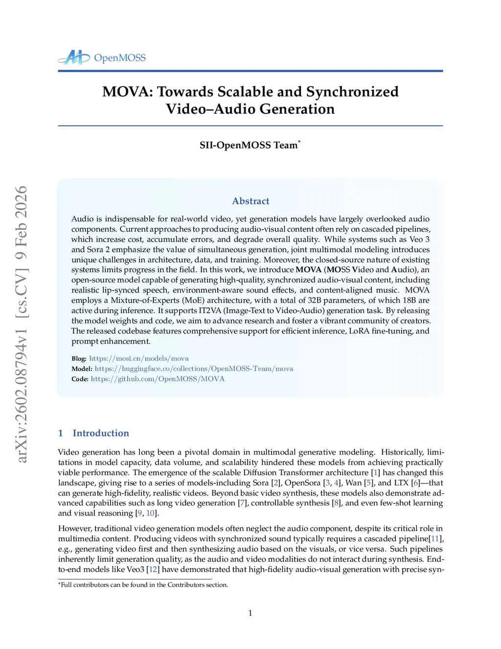 Audio is indispensable for real-world video, yet generation models have largely overlooked audio components. Current approaches to producing audio-visual content often rely on cascaded pipelines, which increase cost, accumulate errors, and degrade overall quality. While systems such as Veo 3 and Sora 2 emphasize the value of simultaneous generation, joint multimodal modeling introduces unique challenges in architecture, data, and training. Moreover, the closed-source nature of existing systems limits progress in the field. In this work, we introduce MOVA (MOSS Video and Audio), an open-source model capable of generating high-quality, synchronized audio-visual content, including realistic lip-synced speech, environment-aware sound effects, and content-aligned music. MOVA employs a Mixture-of-Experts (MoE) architecture, with a total of 32B parameters, of which 18B are active during inference. It supports IT2VA (Image-Text to Video-Audio) generation task. By releasing the model weights and code, we aim to advance research and foster a vibrant community of creators. The released codebase features comprehensive support for efficient inference, LoRA fine-tuning, and prompt enhancement.