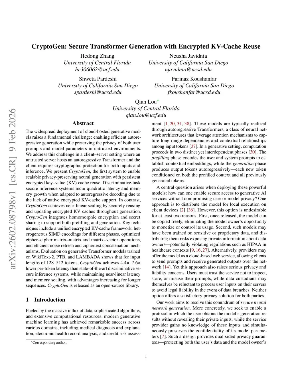 The widespread deployment of cloud-hosted generative models raises a fundamental challenge: enabling efficient autoregressive generation while preserving the privacy of both user prompts and model parameters in untrusted environments. We address this challenge in a client-server setting where an untrusted server hosts an autoregressive Transformer and the client requires cryptographic protection for both inputs and inference. We present CryptoGen, the first system to enable scalable privacy-preserving neural generation with persistent encrypted key-value (KV) cache reuse. Discriminative-task secure inference systems incur quadratic latency and memory growth when adapted to autoregressive decoding due to the lack of native encrypted KV-cache support. In contrast, CryptoGen achieves near-linear scaling by securely reusing and updating encrypted KV caches throughout generation. CryptoGen integrates homomorphic encryption and secret sharing to support both prefilling and generation. Key techniques include a unified encrypted KV-cache framework, heterogeneous SIMD encodings for different phases, optimized cipher-cipher matrix-matrix and matrix-vector operations, and efficient noise refresh and ciphertext concatenation mechanisms. Evaluation on generative Transformer models trained on WikiText-2, PTB, and LAMBADA shows that for input lengths of 128-512 tokens, CryptoGen achieves 4.4x-7.6x lower per-token latency than state-of-the-art discriminative secure inference systems, while maintaining near-linear latency and memory scaling, with advantages increasing for longer sequences. CryptoGen is released as an open-source library.