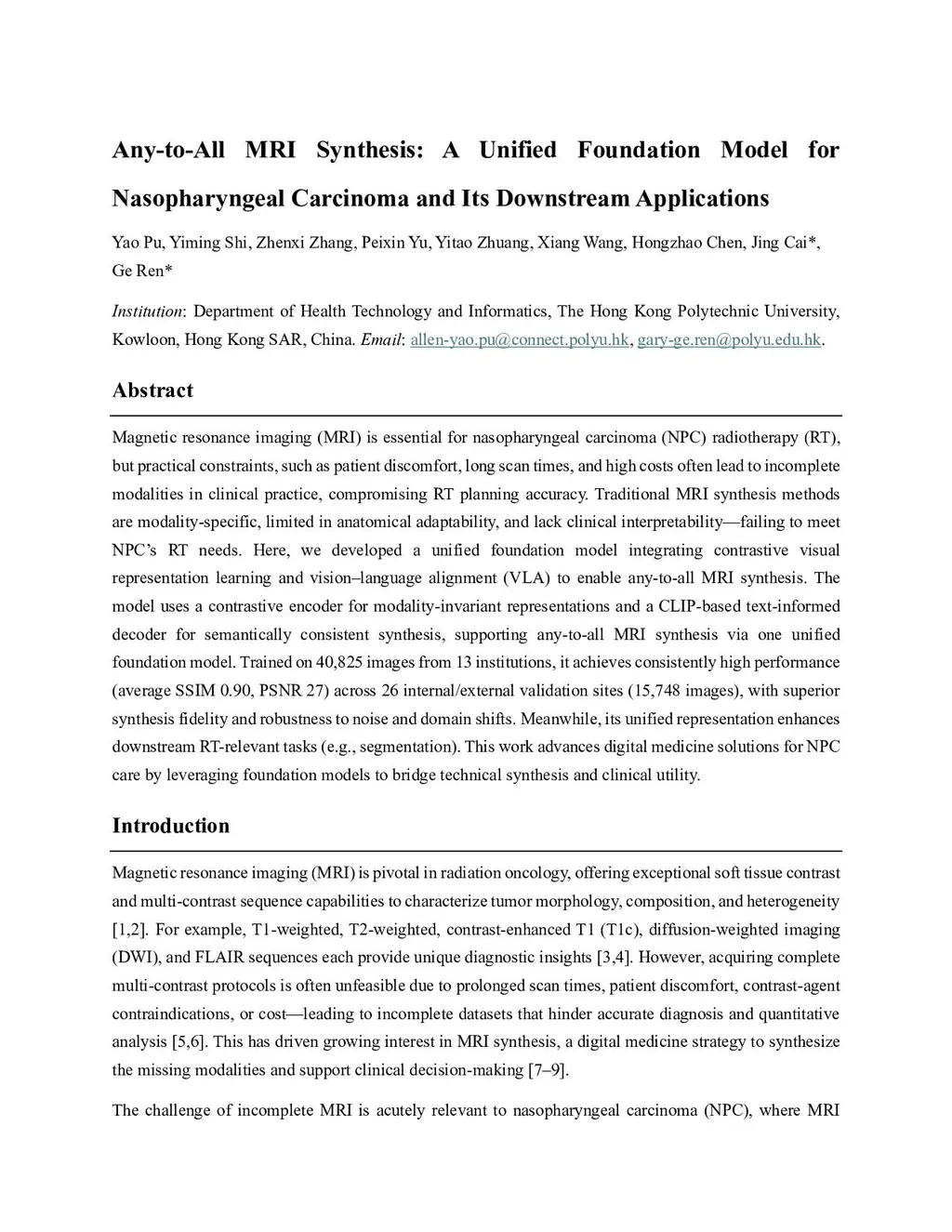 Magnetic resonance imaging (MRI) is essential for nasopharyngeal carcinoma (NPC) radiotherapy (RT), but practical constraints, such as patient discomfort, long scan times, and high costs often lead to incomplete modalities in clinical practice, compromising RT planning accuracy. Traditional MRI synthesis methods are modality-specific, limited in anatomical adaptability, and lack clinical interpretability-failing to meet NPC's RT needs. Here, we developed a unified foundation model integrating contrastive visual representation learning and vision-language alignment (VLA) to enable any-to-all MRI synthesis. The model uses a contrastive encoder for modality-invariant representations and a CLIP-based text-informed decoder for semantically consistent synthesis, supporting any-to-all MRI synthesis via one unified foundation model. Trained on 40,825 images from 13 institutions, it achieves consistently high performance (average SSIM 0.90, PSNR 27) across 26 internal/external validation sites (15,748 images), with superior synthesis fidelity and robustness to noise and domain shifts. Meanwhile, its unified representation enhances downstream RT-relevant tasks (e.g., segmentation). This work advances digital medicine solutions for NPC care by leveraging foundation models to bridge technical synthesis and clinical utility.