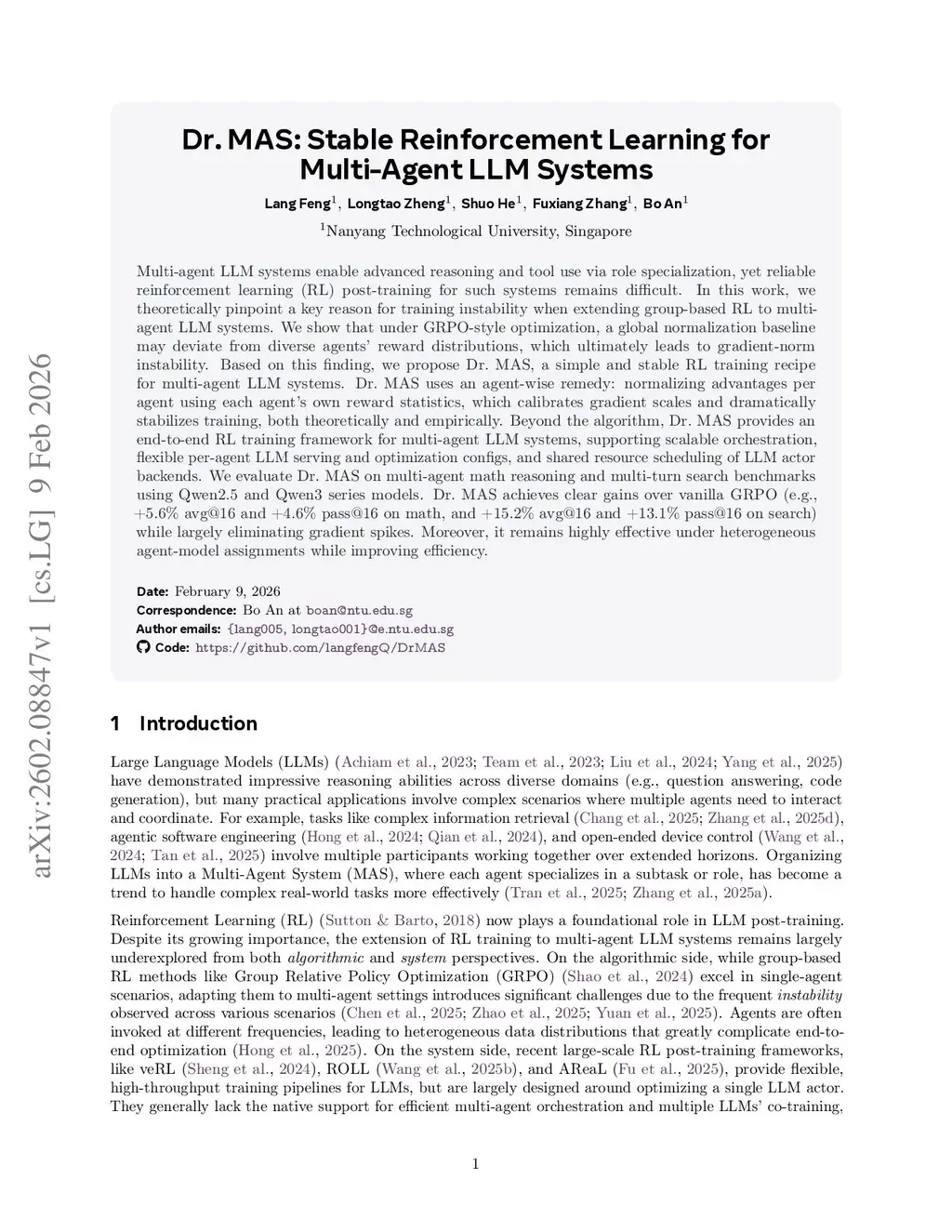 Multi-agent LLM systems enable advanced reasoning and tool use via role specialization, yet reliable reinforcement learning (RL) post-training for such systems remains difficult. In this work, we theoretically pinpoint a key reason for training instability when extending group-based RL to multi-agent LLM systems. We show that under GRPO-style optimization, a global normalization baseline may deviate from diverse agents' reward distributions, which ultimately leads to gradient-norm instability. Based on this finding, we propose Dr. MAS, a simple and stable RL training recipe for multi-agent LLM systems. Dr. MAS uses an agent-wise remedy: normalizing advantages per agent using each agent's own reward statistics, which calibrates gradient scales and dramatically stabilizes training, both theoretically and empirically. Beyond the algorithm, Dr. MAS provides an end-to-end RL training framework for multi-agent LLM systems, supporting scalable orchestration, flexible per-agent LLM serving and optimization configs, and shared resource scheduling of LLM actor backends. We evaluate Dr. MAS on multi-agent math reasoning and multi-turn search benchmarks using Qwen2.5 and Qwen3 series models. Dr. MAS achieves clear gains over vanilla GRPO (e.g., +5.6\% avg@16 and +4.6\% pass@16 on math, and +15.2\% avg@16 and +13.1\% pass@16 on search) while largely eliminating gradient spikes. Moreover, it remains highly effective under heterogeneous agent-model assignments while improving efficiency.