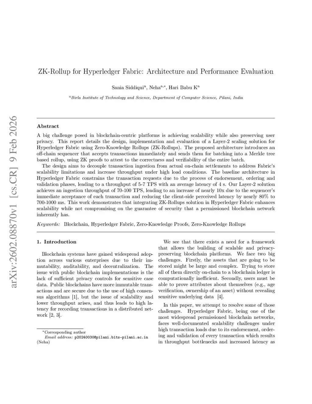 A big challenge posed in blockchain centric platforms is achieving scalability while also preserving user privacy. This report details the design, implementation and evaluation of a Layer-2 scaling solution for Hyperledger Fabric using Zero Knowledge Rollups (ZK Rollups). The proposed architecture introduces an off chain sequencer that accepts transactions immediately and sends them for batching into a Merkle tree based rollup, using ZK proofs to attest to the correctness and verifiability of the entire batch.The design aims to decouple transaction ingestion from actual on chain settlements to address Fabric scalability limitations and increase throughput under high load conditions. The baseline architecture in Hyperledger Fabric constrains transaction requests due to endorsement, ordering and validation phases, leading to a throughput of 5 to 7 TPS with an average latency of 4 seconds. Our Layer-2 solution achieves an ingestion throughput of 70 to 100 TPS, leading to an increase of nearly ten times due to the sequencer immediate acceptance of each transaction and reducing client perceived latency by nearly eighty percent to 700 to 1000 milliseconds. This work demonstrates that integrating ZK Rollups in Hyperledger Fabric enhances scalability while not compromising the security guarantees of a permissioned blockchain network.