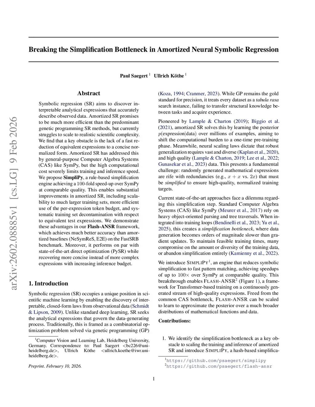 Symbolic regression (SR) aims to discover interpretable analytical expressions that accurately describe observed data. Amortized SR promises to be much more efficient than the predominant genetic programming SR methods, but currently struggles to scale to realistic scientific complexity. We find that a key obstacle is the lack of a fast reduction of equivalent expressions to a concise normalized form. Amortized SR has addressed this by general-purpose Computer Algebra Systems (CAS) like SymPy, but the high computational cost severely limits training and inference speed. We propose SimpliPy, a rule-based simplification engine achieving a 100-fold speed-up over SymPy at comparable quality. This enables substantial improvements in amortized SR, including scalability to much larger training sets, more efficient use of the per-expression token budget, and systematic training set decontamination with respect to equivalent test expressions. We demonstrate these advantages in our Flash-ANSR framework, which achieves much better accuracy than amortized baselines (NeSymReS, E2E) on the FastSRB benchmark. Moreover, it performs on par with state-of-the-art direct optimization (PySR) while recovering more concise instead of more complex expressions with increasing inference budget.