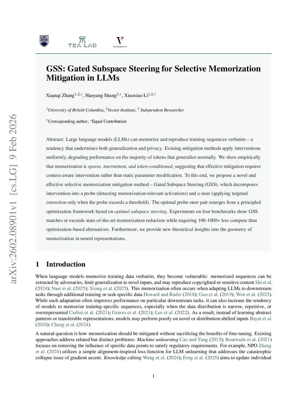 Large language models (LLMs) can memorize and reproduce training sequences verbatim -- a tendency that undermines both generalization and privacy. Existing mitigation methods apply interventions uniformly, degrading performance on the majority of tokens that generalize normally. We show empirically that memorization is sparse, intermittent, and token-conditioned, suggesting that effective mitigation requires context-aware intervention rather than static parameter modification. To this end, we propose a novel and effective selective memorization mitigation method -- Gated Subspace Steering (GSS), which decomposes intervention into a probe (detecting memorization-relevant activations) and a steer (applying targeted correction only when the probe exceeds a threshold). The optimal probe-steer pair emerges from a principled optimization framework based on optimal subspace steering. Experiments on four benchmarks show GSS matches or exceeds state-of-the-art memorization reduction while requiring less compute than optimization-based alternatives. Furthermore, we provide new theoretical insights into the geometry of memorization in neural representations.