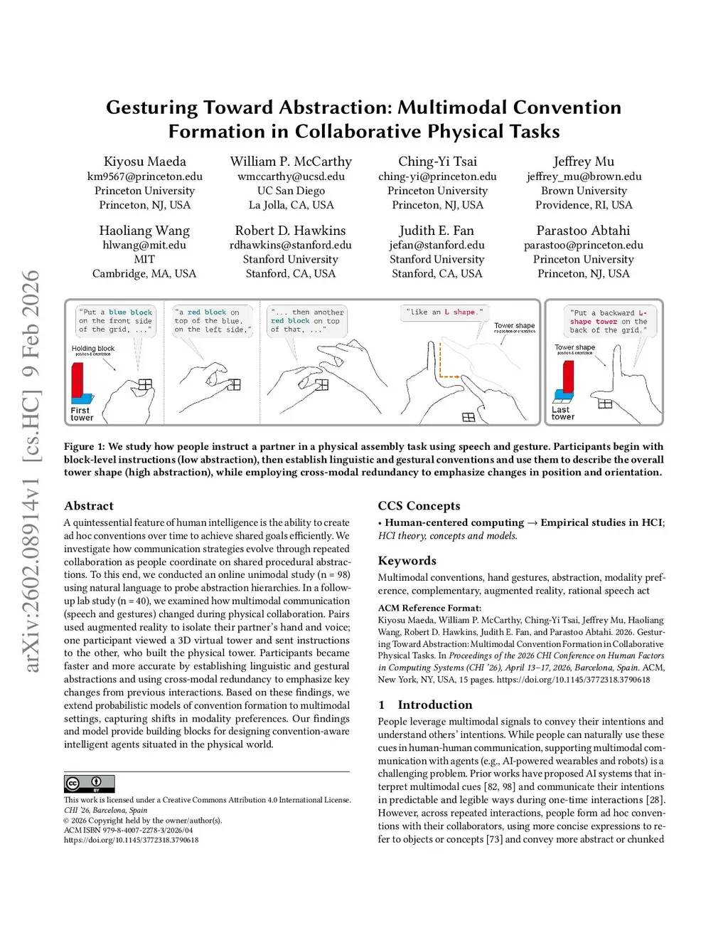 A quintessential feature of human intelligence is the ability to create ad hoc conventions over time to achieve shared goals efficiently. We investigate how communication strategies evolve through repeated collaboration as people coordinate on shared procedural abstractions. To this end, we conducted an online unimodal study (n = 98) using natural language to probe abstraction hierarchies. In a follow-up lab study (n = 40), we examined how multimodal communication (speech and gestures) changed during physical collaboration. Pairs used augmented reality to isolate their partner's hand and voice; one participant viewed a 3D virtual tower and sent instructions to the other, who built the physical tower. Participants became faster and more accurate by establishing linguistic and gestural abstractions and using cross-modal redundancy to emphasize key changes from previous interactions. Based on these findings, we extend probabilistic models of convention formation to multimodal settings, capturing shifts in modality preferences. Our findings and model provide building blocks for designing convention-aware intelligent agents situated in the physical world.