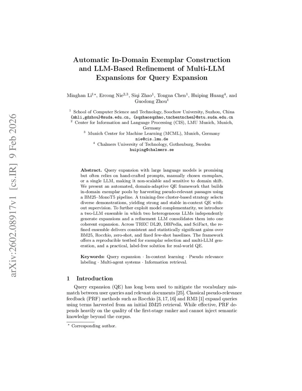 Automatic In-Domain Exemplar Construction and LLM-Based Refinement of Multi-LLM Expansions for Query Expansion
