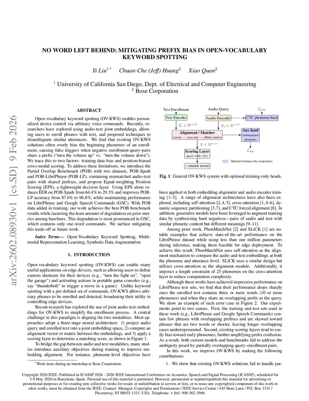 Open-vocabulary keyword spotting (OV-KWS) enables personalized device control via arbitrary voice commands. Recently, researchers have explored using audio-text joint embeddings, allowing users to enroll phrases with text, and proposed techniques to disambiguate similar utterances. We find that existing OV-KWS solutions often overly bias the beginning phonemes of an enrollment, causing false triggers when negative enrollment-query-pairs share a prefix (``turn the volume up'' vs. ``turn the volume down''). We trace this to two factors: training data bias and position-biased cross-modal scoring. To address these limitations, we introduce the Partial Overlap Benchmark (POB) with two datasets, POB-Spark and POB-LibriPhrase (POB-LP), containing mismatched audio-text pairs with shared prefixes, and propose Equal-weighting Position Scoring (EPS), a lightweight decision layer. Using EPS alone reduces EER on POB-Spark from 64.4\% to 29.3\% and improves POB-LP accuracy from 87.6\% to 96.8\%, while maintaining performance on LibriPhrase and Google Speech Commands (GSC). With POB data added in training, our work achieves the best POB benchmark results while incurring the least amount of degradation on prior metrics among baselines. This degradation is most pronounced in GSC, which contains only one-word commands. We surface mitigating this trade-off as future work.