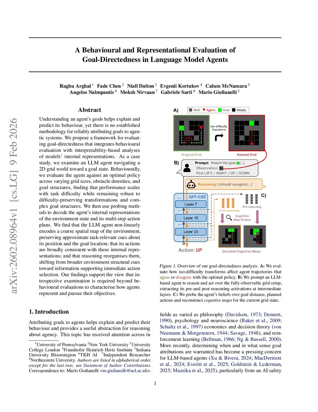 Understanding an agent's goals helps explain and predict its behaviour, yet there is no established methodology for reliably attributing goals to agentic systems. We propose a framework for evaluating goal-directedness that integrates behavioural evaluation with interpretability-based analyses of models' internal representations. As a case study, we examine an LLM agent navigating a 2D grid world toward a goal state. Behaviourally, we evaluate the agent against an optimal policy across varying grid sizes, obstacle densities, and goal structures, finding that performance scales with task difficulty while remaining robust to difficulty-preserving transformations and complex goal structures. We then use probing methods to decode the agent's internal representations of the environment state and its multi-step action plans. We find that the LLM agent non-linearly encodes a coarse spatial map of the environment, preserving approximate task-relevant cues about its position and the goal location; that its actions are broadly consistent with these internal representations; and that reasoning reorganises them, shifting from broader environment structural cues toward information supporting immediate action selection. Our findings support the view that introspective examination is required beyond behavioural evaluations to characterise how agents represent and pursue their objectives.