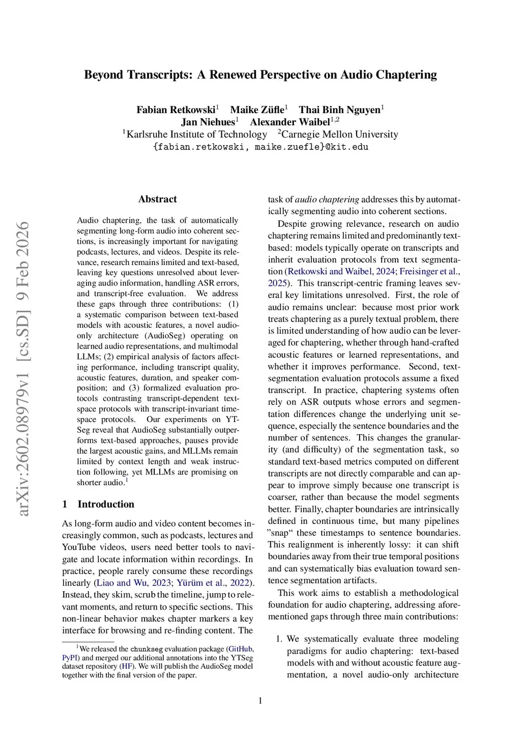 Audio chaptering, the task of automatically segmenting long-form audio into coherent sections, is increasingly important for navigating podcasts, lectures, and videos. Despite its relevance, research remains limited and text-based, leaving key questions unresolved about leveraging audio information, handling ASR errors, and transcript-free evaluation. We address these gaps through three contributions: (1) a systematic comparison between text-based models with acoustic features, a novel audio-only architecture (AudioSeg) operating on learned audio representations, and multimodal LLMs; (2) empirical analysis of factors affecting performance, including transcript quality, acoustic features, duration, and speaker composition; and (3) formalized evaluation protocols contrasting transcript-dependent text-space protocols with transcript-invariant time-space protocols. Our experiments on YTSeg reveal that AudioSeg substantially outperforms text-based approaches, pauses provide the largest acoustic gains, and MLLMs remain limited by context length and weak instruction following, yet MLLMs are promising on shorter audio.