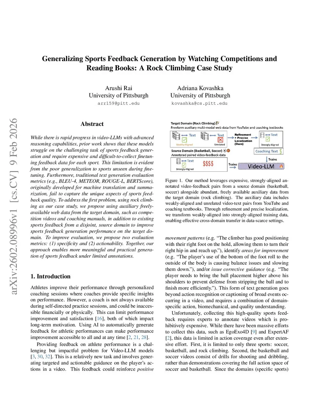 While there is rapid progress in video-LLMs with advanced reasoning capabilities, prior work shows that these models struggle on the challenging task of sports feedback generation and require expensive and difficult-to-collect finetuning feedback data for each sport. This limitation is evident from the poor generalization to sports unseen during finetuning. Furthermore, traditional text generation evaluation metrics (e.g., BLEU-4, METEOR, ROUGE-L, BERTScore), originally developed for machine translation and summarization, fail to capture the unique aspects of sports feedback quality. To address the first problem, using rock climbing as our case study, we propose using auxiliary freely-available web data from the target domain, such as competition videos and coaching manuals, in addition to existing sports feedback from a disjoint, source domain to improve sports feedback generation performance on the target domain. To improve evaluation, we propose two evaluation metrics: (1) specificity and (2) actionability. Together, our approach enables more meaningful and practical generation of sports feedback under limited annotations.