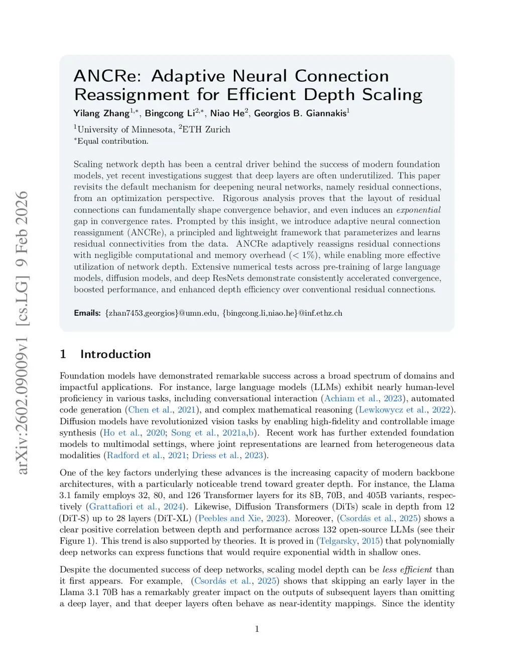 Scaling network depth has been a central driver behind the success of modern foundation models, yet recent investigations suggest that deep layers are often underutilized. This paper revisits the default mechanism for deepening neural networks, namely residual connections, from an optimization perspective. Rigorous analysis proves that the layout of residual connections can fundamentally shape convergence behavior, and even induces an exponential gap in convergence rates. Prompted by this insight, we introduce adaptive neural connection reassignment (ANCRe), a principled and lightweight framework that parameterizes and learns residual connectivities from the data. ANCRe adaptively reassigns residual connections with negligible computational and memory overhead (), while enabling more effective utilization of network depth. Extensive numerical tests across pre-training of large language models, diffusion models, and deep ResNets demonstrate consistently accelerated convergence, boosted performance, and enhanced depth efficiency over conventional residual connections.