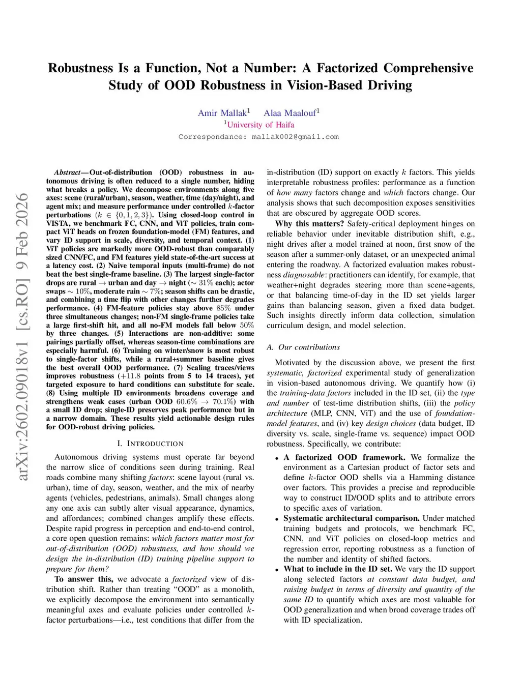 Out of distribution (OOD) robustness in autonomous driving is often reduced to a single number, hiding what breaks a policy. We decompose environments along five axes: scene (rural/urban), season, weather, time (day/night), and agent mix; and measure performance under controlled -factor perturbations (). Using closed loop control in VISTA, we benchmark FC, CNN, and ViT policies, train compact ViT heads on frozen foundation-model (FM) features, and vary ID support in scale, diversity, and temporal context. (1) ViT policies are markedly more OOD-robust than comparably sized CNN/FC, and FM features yield state-of-the-art success at a latency cost. (2) Naive temporal inputs (multi-frame) do not beat the best single-frame baseline. (3) The largest single factor drops are rural urban and day night ( each); actor swaps , moderate rain ; season shifts can be drastic, and combining a time flip with other changes further degrades performance. (4) FM-feature policies stay above under three simultaneous changes; non-FM single-frame policies take a large first-shift hit, and all no-FM models fall below by three changes. (5) Interactions are non-additive: some pairings partially offset, whereas season-time combinations are especially harmful. (6) Training on winter/snow is most robust to single-factor shifts, while a rural+summer baseline gives the best overall OOD performance. (7) Scaling traces/views improves robustness ( points from to traces), yet targeted exposure to hard conditions can substitute for scale. (8) Using multiple ID environments broadens coverage and strengthens weak cases (urban OOD ) with a small ID drop; single-ID preserves peak performance but in a narrow domain. These results yield actionable design rules for OOD-robust driving policies.