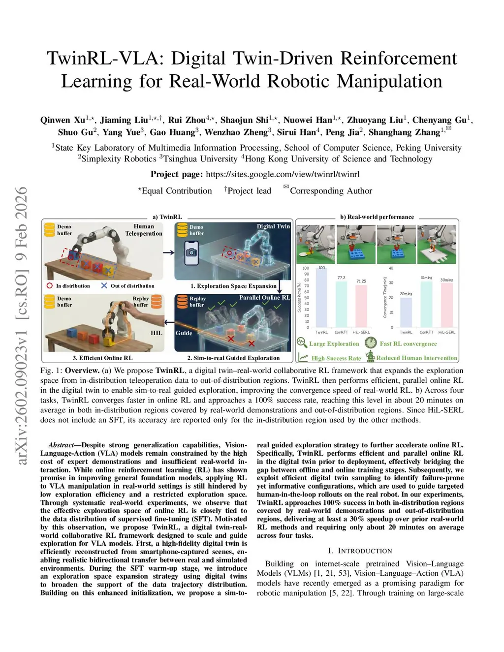 Despite strong generalization capabilities, Vision-Language-Action (VLA) models remain constrained by the high cost of expert demonstrations and insufficient real-world interaction. While online reinforcement learning (RL) has shown promise in improving general foundation models, applying RL to VLA manipulation in real-world settings is still hindered by low exploration efficiency and a restricted exploration space. Through systematic real-world experiments, we observe that the effective exploration space of online RL is closely tied to the data distribution of supervised fine-tuning (SFT). Motivated by this observation, we propose TwinRL, a digital twin-real-world collaborative RL framework designed to scale and guide exploration for VLA models. First, a high-fidelity digital twin is efficiently reconstructed from smartphone-captured scenes, enabling realistic bidirectional transfer between real and simulated environments. During the SFT warm-up stage, we introduce an exploration space expansion strategy using digital twins to broaden the support of the data trajectory distribution. Building on this enhanced initialization, we propose a sim-to-real guided exploration strategy to further accelerate online RL. Specifically, TwinRL performs efficient and parallel online RL in the digital twin prior to deployment, effectively bridging the gap between offline and online training stages. Subsequently, we exploit efficient digital twin sampling to identify failure-prone yet informative configurations, which are used to guide targeted human-in-the-loop rollouts on the real robot. In our experiments, TwinRL approaches 100% success in both in-distribution regions covered by real-world demonstrations and out-of-distribution regions, delivering at least a 30% speedup over prior real-world RL methods and requiring only about 20 minutes on average across four tasks.